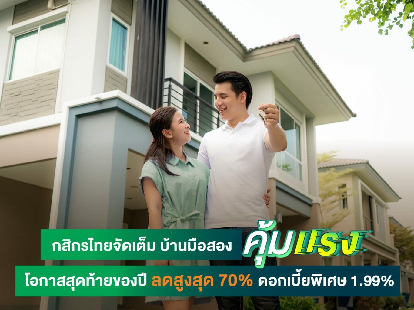 ธนาคารกสิกรไทย ส่งแคมเปญบ้านมือสองกสิกรไทย “คุ้มแรง” ปิดท้ายปี โอกาสสุดท้ายที่คนอยากมีบ้านต้องรีบคว้าไว้ โดยคัดทรัพย์มือสองคุณภาพดี ทำเลเยี่ยม หลากหลายประเภท ได้แก่ บ้านเดี่ยว ทาวน์เฮ้าส์ คอนโดมิเนียม อาคารพาณิชย์ ที่ดินเปล่า และทรัพย์เพื่อทำธุรกิจ เช่น โกดัง โรงงาน อพาร์ตเมนต์ ลดแรงสูงสุดถึง 70% ฟรีค่าโอนสูงสุด 300,000 บาท รับอัตราดอกเบี้ยพิเศษ 1.99% นาน 1 ปีแรก กู้ได้สูงสุด 110% ในกรณีที่กู้ไม่ผ่านทางธนาคารจะคืนเงินมัดจำ และคุ้มยิ่งกว่าเมื่อซื้อทรัพย์มือสองในกลุ่มทรัพย์ดับเบิ้ลคุ้ม รับฟรีบัตรของขวัญเซ็นทรัลมูลค่า 15,000 บาท (จำนวนจำกัด) พร้อมส่วนลดสำหรับซื้อและติดตั้งโซลาร์รูฟ จาก PSI มูลค่าสูงสุด 121,000 บาท การันตี คัด คุ้ม ครบ ไม่ว่าซื้อเพื่ออยู่อาศัย หรือลงทุนปล่อยเช่า-ขายต่อก็คุ้มค่า