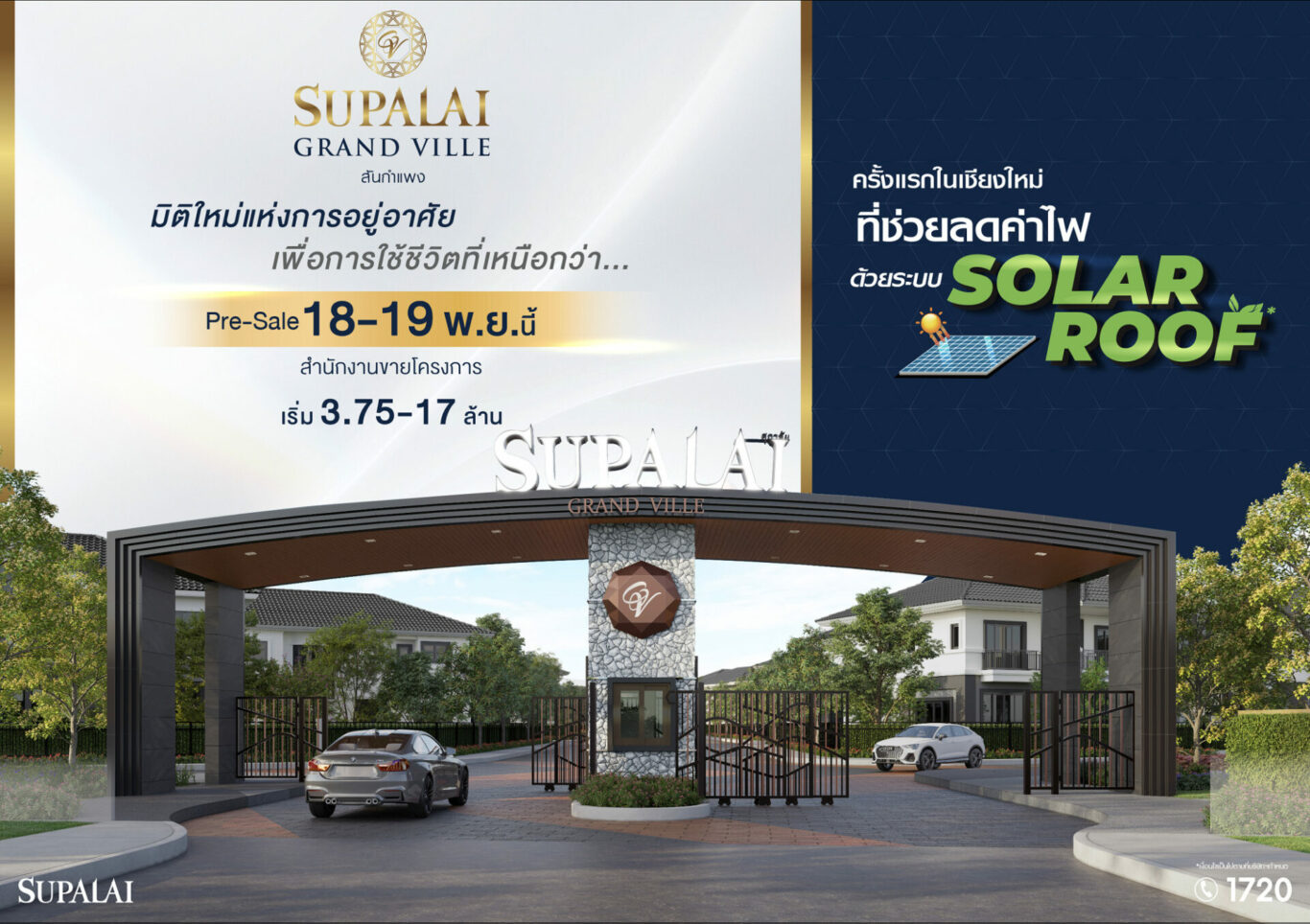 บมจ.ศุภาลัย แอ่วเหนือ รุกเชียงใหม่ต่อเนื่อง เปิดตัวโครงการ “ศุภาลัย แกรนด์วิลล์ สันกำแพง” ครั้งแรกในเชียงใหม่ ที่ช่วยลดค่าไฟฟ้าด้วยระบบหลังคาโซลาร์ กับแบบบ้านซีรีส์ล่าสุดสไตล์ Tropical Modern บนทำเลริมถนนสันกำแพงสายเก่า ใกล้วงแหวนรอบกลาง เชื่อมต่อการเดินทางได้หลากหลาย ห่างจากแยกหนองประทีปประมาณ 3 กม. พร้อมยกระดับคุณภาพชีวิตสู่ Smart Life ครบทุกมิติ กับบ้านเดี่ยวและบ้านแฝด 2 ชั้น ราคาพิเศษเริ่มต้น 3.75-17 ล้านบาท* พบกันงานพรีเซล 18-19 พ.ย.นี้ แถมฟรี Solar Rooftop เฉพาะบ้านเดี่ยว* พร้อมแอร์ 3 ห้องนอน/ Home Automation & Security ทุกหลัง