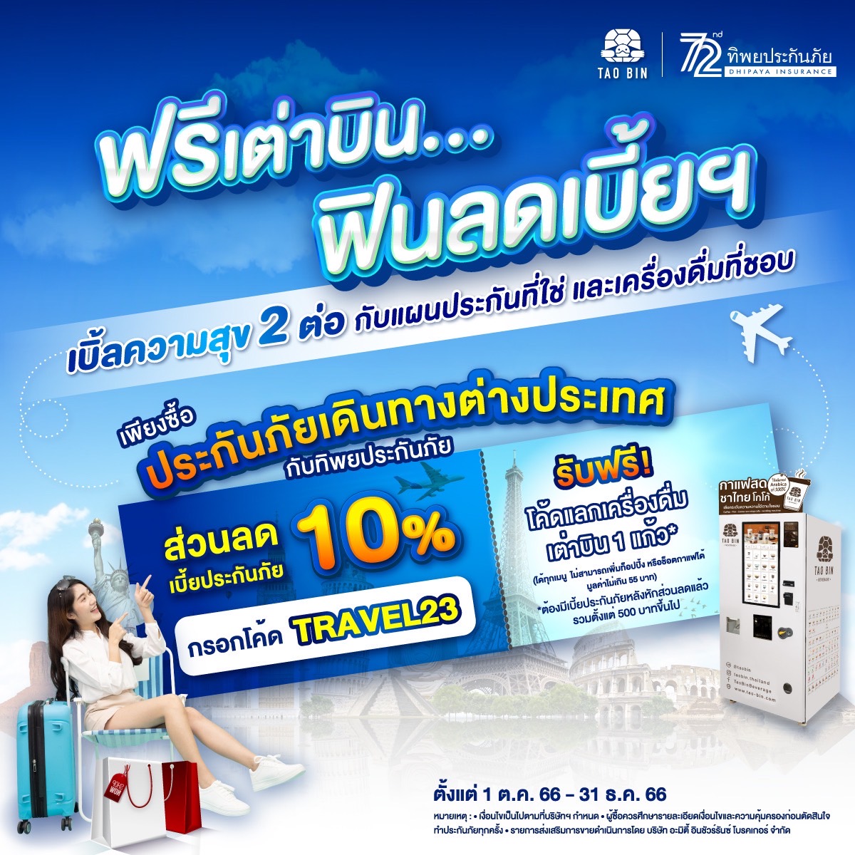 ทิพยประกันภัย ฉลองครบรอบ 72 ปี เบิ้ลความสุข 2 ต่อ มอบโปรโมชันพิเศษสำหรับผู้ที่ซื้อประกันภัยเดินทางต่างประเทศ ต่อที่ 1 มอบความพิเศษเฉพาะผู้ที่ซื้อประกันเดินทางต่างประเทศ ผ่านเว็บไซต์ WWW.TIPINSURE.COM เพียงกรอกโค้ด TRAVEL23 ก่อนชำระเงิน รับส่วนลด 10% ทันที ต่อที่ 2 ซื้อประกันเดินทางต่างประเทศที่มีเบี้ยประกันรวม 500 บาทขึ้นไป (หลังหักส่วนลดแล้ว) รับโค้ดแลกเครื่องดื่มเต่าบินฟรี 1 แก้ว สามารถกดรับได้ทุกเมนู (ไม่สามารถเพิ่มท็อปปิ้ง หรือช็อตกาแฟ) มูลค่าไม่เกิน 55 บาท ตั้งแต่วันนี้ – 31 ธันวาคม 2566