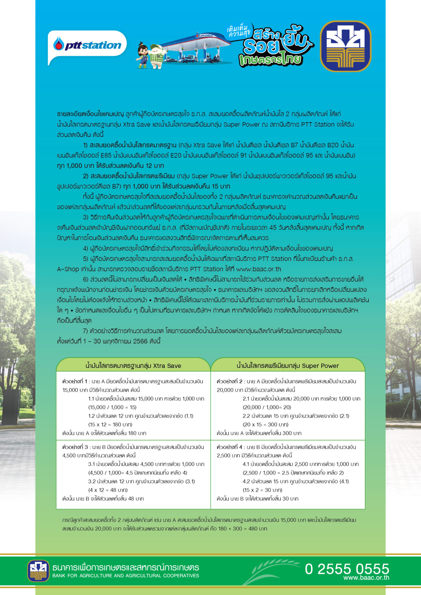 ศึกษารายละเอียดเพิ่มเติมได้ที่เว็บไซต์ www.baac.or.th Call Center 02 555 0555 หรือ www.pttor.com Contact Center โทร 1365