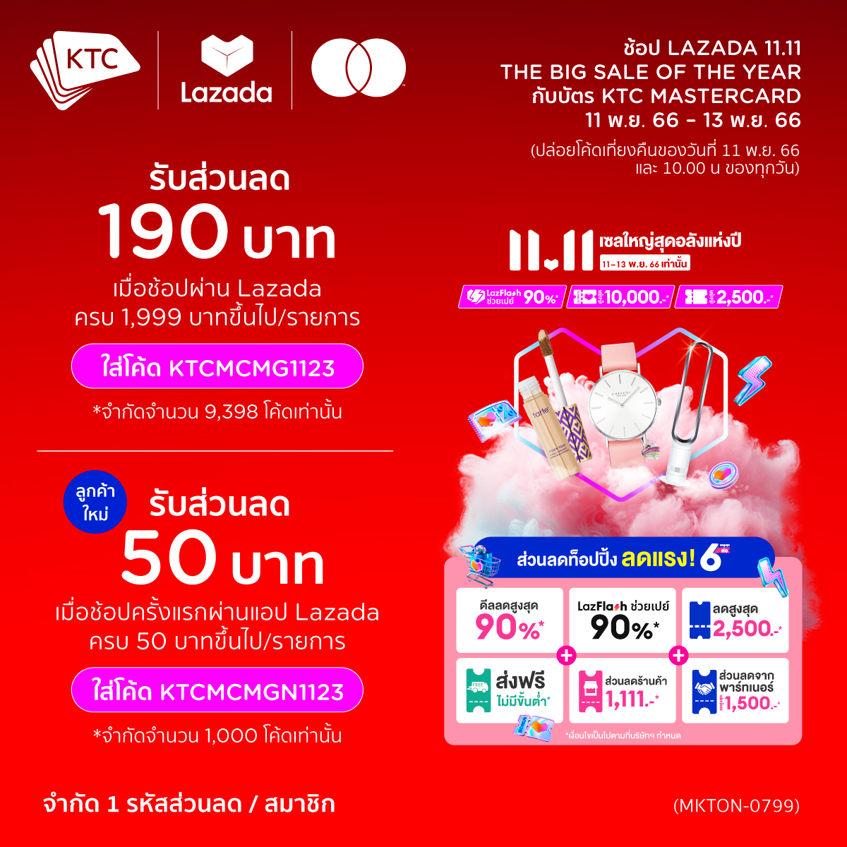 “ในช่วงไตรมาสสุดท้ายของปีนี้ เคทีซีจึงได้ผนึกความร่วมมือกับมาสเตอร์การ์ด บริษัทเทคโนโลยีการชำระเงินระดับโลก และลาซาด้า ประเทศไทย ผู้นำแพลตฟอร์มอีคอมเมิร์ซในเอเชียตะวันออกเฉียงใต้ จัดแคมเปญการตลาดถึง 3 แคมเปญในเดือนพฤศจิกายน เพื่อส่งมอบความคุ้มค่าสุดพิเศษเฉพาะสมาชิกบัตรเครดิตเคทีซี-มาสเตอร์การ์ด เมื่อช้อปสินค้าผ่านเว็บไซต์ www.lazada.co.th หรือแอปพลิเคชันลาซาด้า 1) แคมเปญ KTC Lazada 11.11 The Big Sale of the Year รับส่วนลด 190 บาท เมื่อช้อปตั้งแต่ 1,999 บาทขึ้นไปต่อยอดซื้อสุทธิ และใช้รหัสส่วนลด “KTCMCMG1123” ก่อนการชำระเงิน ระหว่างวันที่ 11-13 พฤศจิกายน 2566 พิเศษ ลูกค้าใหม่ที่ช้อปสินค้าครั้งแรกผ่านแอปพลิเคชันลาซาด้า ตั้งแต่ 50 บาทขึ้นไปต่อรายการซื้อสุทธิ จะได้รับส่วนลด 50 บาท ทันที เพียงระบุรหัสส่วนลด “KTCMCMGN1123 โดยสมาชิกไม่ต้องลงทะเบียนเข้าร่วมกิจกรรม  2) แคมเปญ Mid Month Sale รับส่วนลด 140 บาท เมื่อช้อป 999 บาทต่อยอดซื้อ และใช้รหัสส่วนลด “KTCMCMM1123” ก่อนการชำระเงิน เฉพาะวันที่ 15 พฤศจิกายน 2566 (เริ่มเที่ยงคืนเป็นต้นไป)  และ 3) แคมเปญ Pay Day Sale รับส่วนลด 150 บาท เมื่อช้อป 1,499 บาท และใช้รหัสส่วนลด “KTCMCPD1123” ก่อนการชำระเงิน ระหว่างวันที่ 25 พฤศจิกายน 2566 – 1 ธันวาคม 2566 (ปล่อยโค้ดส่วนลดเที่ยงคืนวันที่ 25 พฤศจิกายนเป็นต้นไป) ดูรายละเอียดโปรโมชันเพิ่มเติมได้ที่ https://www.ktc.co.th/promotion/online/shopping/lazada-all