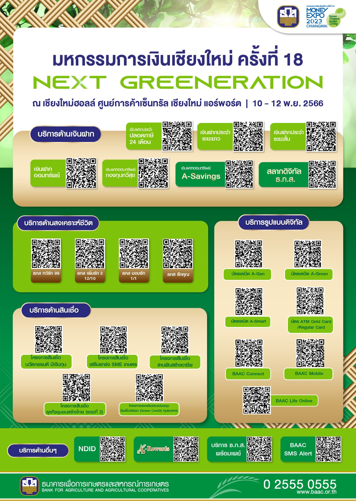 นายไพศาล หงษ์ทอง ผู้ช่วยผู้จัดการและโฆษกธนาคารเพื่อการเกษตรและสหกรณ์การเกษตร (ธ.ก.ส.) เปิดเผยว่า ธ.ก.ส. เข้าร่วมงานมหกรรมการเงินเชียงใหม่ ครั้งที่ 18 ซึ่งจัดขึ้นระหว่างวันที่ 10 – 12 พฤศจิกายน 2566 ณ เชียงใหม่ ฮอลล์ ศูนย์การค้าเซ็นทรัล เชียงใหม่ แอร์พอร์ต โดย ธ.ก.ส. นำแคมเปญพิเศษ“Exclusive 58” เพียงฝากเงินบัญชีออมทรัพย์ตั้งแต่ 50,000 บาท สูงสุดถึง 500,000 บาท และคงยอดเงินฝาก 158 วัน รับเลยผลตอบแทนแบบขั้นบันได สูงสุดร้อยละ 15.80 ต่อปี เฉลี่ยร้อยละ 3.50 ต่อปี และคะแนน A-Rewards 1,000 คะแนน (จำกัด 15 สิทธิ์ต่อวัน) “แคมเปญ Step Up” ฝากเงินตั้งแต่ 50,000 บาท สูงสุดถึง 5,000,000 บาท ระยะเวลา 10 เดือน รับดอกเบี้ยแบบขั้นบันไดสูงสุดกว่า 6.20% ต่อปี “แคมเปญฝากแสน แถมพัน” เมื่อสมัครใช้บริการ A-Mobile Plus และฝากเงินบัญชีออมทรัพย์ A-Savings 100,000 บาทขึ้นไป รับคะแนน A-Rewards 1,000 คะแนน ชวนออมเงินพร้อมลุ้นรางวัลกับสลาก ธ.ก.ส. ชุดถุงทอง หน่วยละ 2,000 บาทอายุสลาก 2 ปี วงเงินรวม 100,000 ล้านบาท เมื่อฝากครบกำหนดรับดอกเบี้ยหน่วยละ 35 บาท (ร้อยละ 0.875 ต่อหน่วย) พร้อมลุ้นรางวัล Grand Prize 60 ล้านบาท และรางวัลอื่น ๆ อีกรวม 77 ล้านบาททุกงวด พิเศษหรือออมเบา ๆ กับสลากออมทรัพย์ ชุดมั่งมีทวีโชค ราคาหน่วยละ 100 บาท อายุสลาก 1 ปี วงเงินรวม 100,000 ล้านบาท เมื่อฝากครบกำหนดรับดอกเบี้ยทันทีร้อยละ 0.25 ต่อปี พร้อมได้ลุ้นรางวัลใหญ่ถึง 10 ล้านบาท และรางวัลอื่น ๆ รวมมูลค่ากว่า 66 ล้านบาทต่อเดือนหรือฝากสลากดิจิทัล ธ.ก.ส. ราคาหน่วยละ 50 บาท อายุสลาก 2 ปี เมื่อครบกำหนดจะได้รับดอกเบี้ยหน่วยละ 0.07 บาท พร้อมลุ้นรางวัลที่ 1 มูลค่า 5,000,000 บาท และรางวัลอื่น ๆ อีกมากมาย รวมเงินรางวัล 15,917,000 บาทต่อเดือน ฝากง่าย ๆ ผ่านแอปพลิเคชัน BAAC Mobile ที่สำคัญดอกเบี้ยและเงินรางวัลได้รับการยกเว้นภาษี นอกจากนี้ยังมี ผลิตภัณฑ์เงินฝากและเงินฝากสงเคราะห์ชีวิตอีกมากมาย และ พิเศษเฉพาะในงาน! แคมเปญถุงทองโบนัส สำหรับลูกค้าใหม่ที่เปิดบัญชีและฝากสลาก ธ.ก.ส. ชุดถุงทอง ตั้งแต่ 10,000,000 บาทขึ้นไป รับโบนัสสลาก ธ.ก.ส. ชุดถุงทองอีก 10,000 บาท (จำกัด 100 รายตลอดระยะเวลาแคมเปญ เงื่อนไขอื่น ๆ เป็นไปตามที่ธนาคารกำหนด) เมื่อสมัครกรมธรรม์ ธกส เพิ่มรัก3 12/10 รับทันที กระเป๋าเดินทางล้อลากขนาด 20 นิ้ว และกระเป๋าเดินทางหูหิ้ว ขนาด 14 นิ้ว หรือสมัครกรมธรรม์ ธกส รักคุณ Easy Life ผ่านแอปพลิเคชัน BAACLife Online รับกระเป๋าผ้าแคนวาส หรือกระบอกน้ำเก็บความร้อน – เย็น