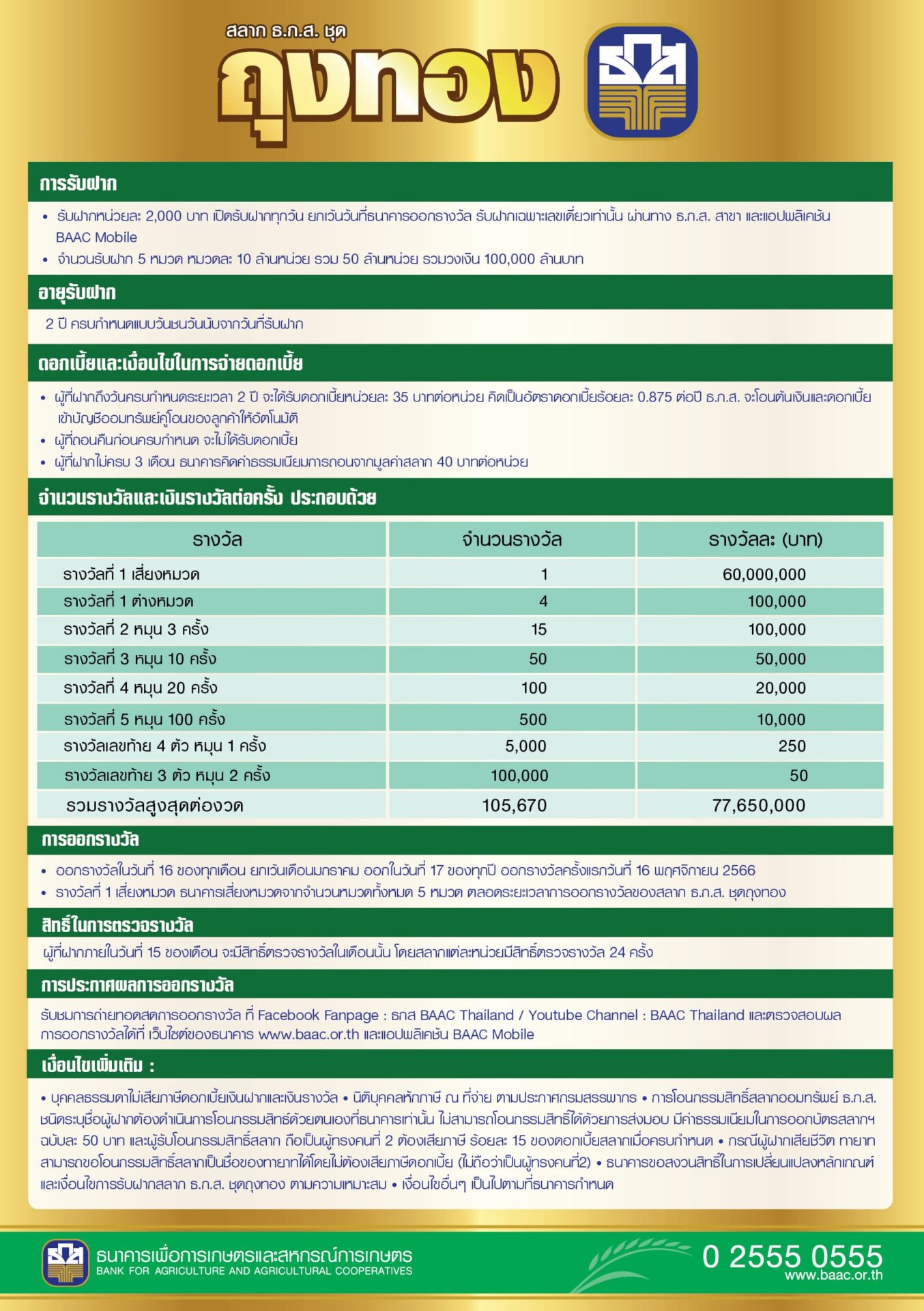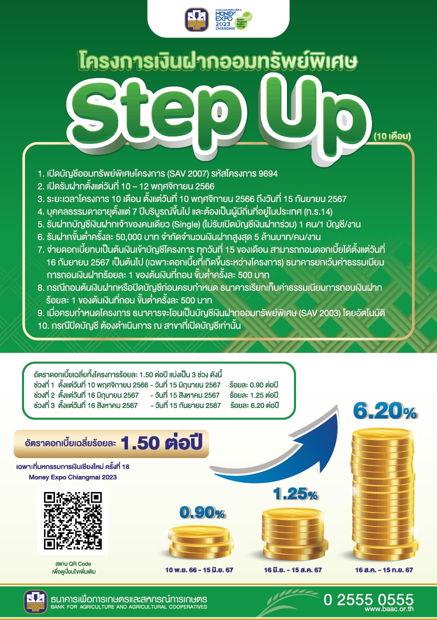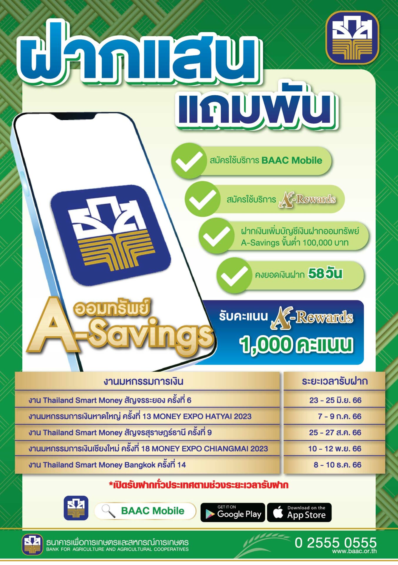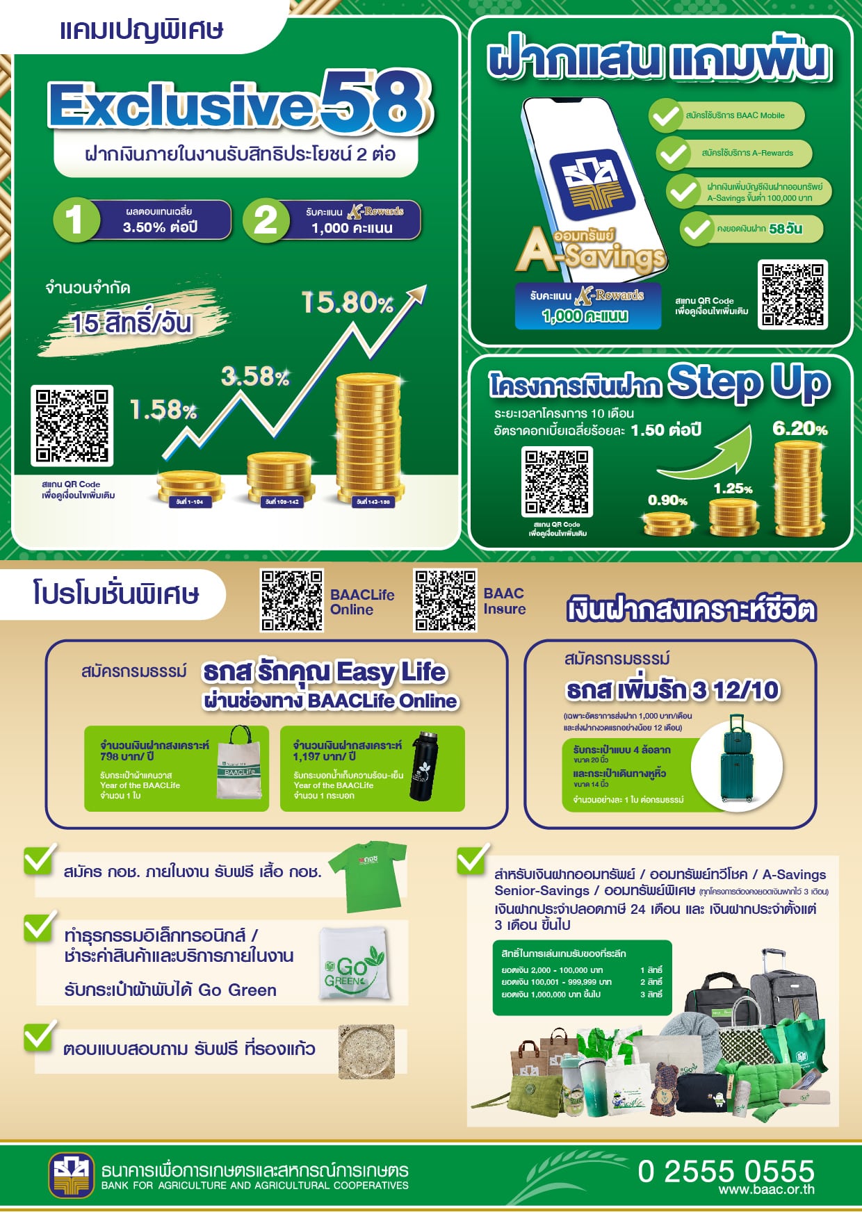ธ.ก.ส. ชวนออมเงินแคมเปญ Exclusive 58 รับดอกเบี้ยแบบขั้นบันได สูงสุด 15.80% ต่อปี แถม A-rewards อีก 1,000 คะแนน แคมเปญ Step Up ฝากเงิน 10 เดือน รับดอกเบี้ยสูงสุดกว่า 6.20% ต่อปี และร่วมลุ้นรางวัลกับสลาก ธ.ก.ส. ชุดถุงทอง หน่วยละ 2,000 บาท ลุ้นรางวัล Grand Prize 60 ล้านบาท ถึง 24 งวด พร้อมบริการสินเชื่ออัตราดอกเบี้ยพิเศษหนุนธุรกิจที่เป็นมิตรกับสิ่งแวดล้อม ทั้งสินเชื่อ BCG สินเชื่อแทนคุณ และการให้คำปรึกษาด้านการเงิน พิเศษเฉพาะในงาน! แคมเปญถุงทองโบนัสสำหรับลูกค้าใหม่ เมื่อฝากสลาก ธ.ก.ส. ชุดถุงทอง ตั้งแต่ 10 ล้านบาทขึ้นไป รับโบนัสอีก 10,000 บาท