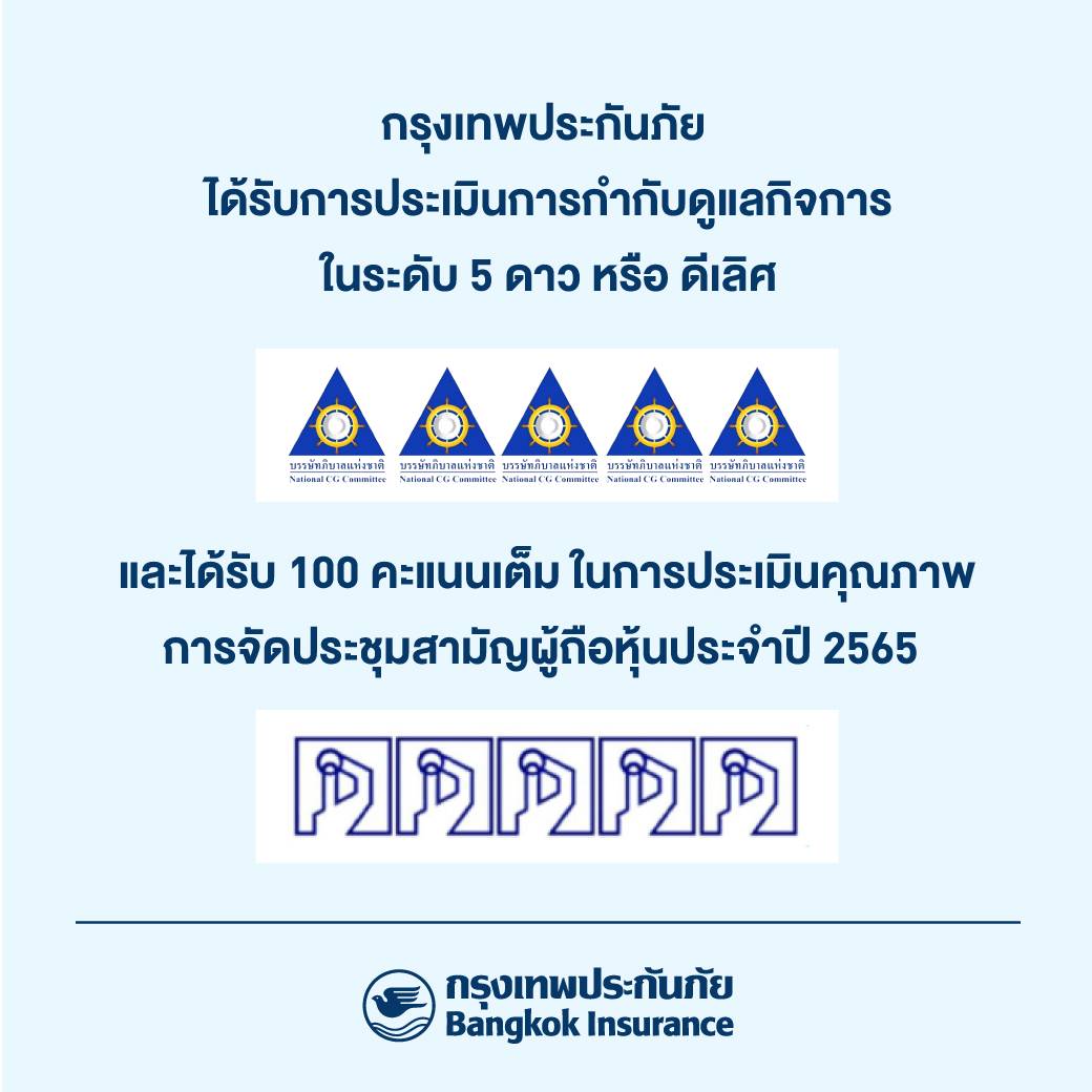 บริษัท กรุงเทพประกันภัย จำกัด (มหาชน) ได้รับผลการประเมินการกำกับดูแลกิจการบริษัทจดทะเบียน ประจำปี 2566 (Corporate Governance Report of Thai Listed Companies 2023 : CGR) ในระดับ 5 ดาว หรือ “ดีเลิศ” (Excellent CG Scoring) ต่อเนื่องเป็นปีที่ 4 จากสมาคมส่งเสริมสถาบันกรรมการบริษัทไทย โดยการสนับสนุนจากตลาดหลักทรัพย์แห่งประเทศไทยและสำนักงานคณะกรรมการกำกับหลักทรัพย์และตลาดหลักทรัพย์ โดยกรุงเทพประกันภัยได้รับคะแนนประเมิน 103% สูงกว่าคะแนนเฉลี่ยของบริษัทจดทะเบียนไทยโดยรวม ซึ่งอยู่ที่ 81% จากบริษัทจดทะเบียนทั้งหมด 782 บริษัท และได้รับการจัดอันดับอยู่ใน Top Quartile ของบริษัทจดทะเบียนกลุ่มธุรกิจการเงิน ซึ่งสะท้อนให้เห็นถึงศักยภาพการดำเนินธุรกิจของบริษัทฯ ที่ให้ความสำคัญในการกำกับดูแลกิจการภายใต้หลักบรรษัทภิบาล ทั้งในมิติเศรษฐกิจ สังคม และสิ่งแวดล้อม โดยคำนึงถึงผู้มีส่วนได้เสียทุกกลุ่มควบคู่ไปกับการดำเนินธุรกิจให้เติบโตอย่างยั่งยืน รวมถึงมีการปรับบทบาทและภาวะผู้นำของกรรมการในเชิงรุกมากขึ้น