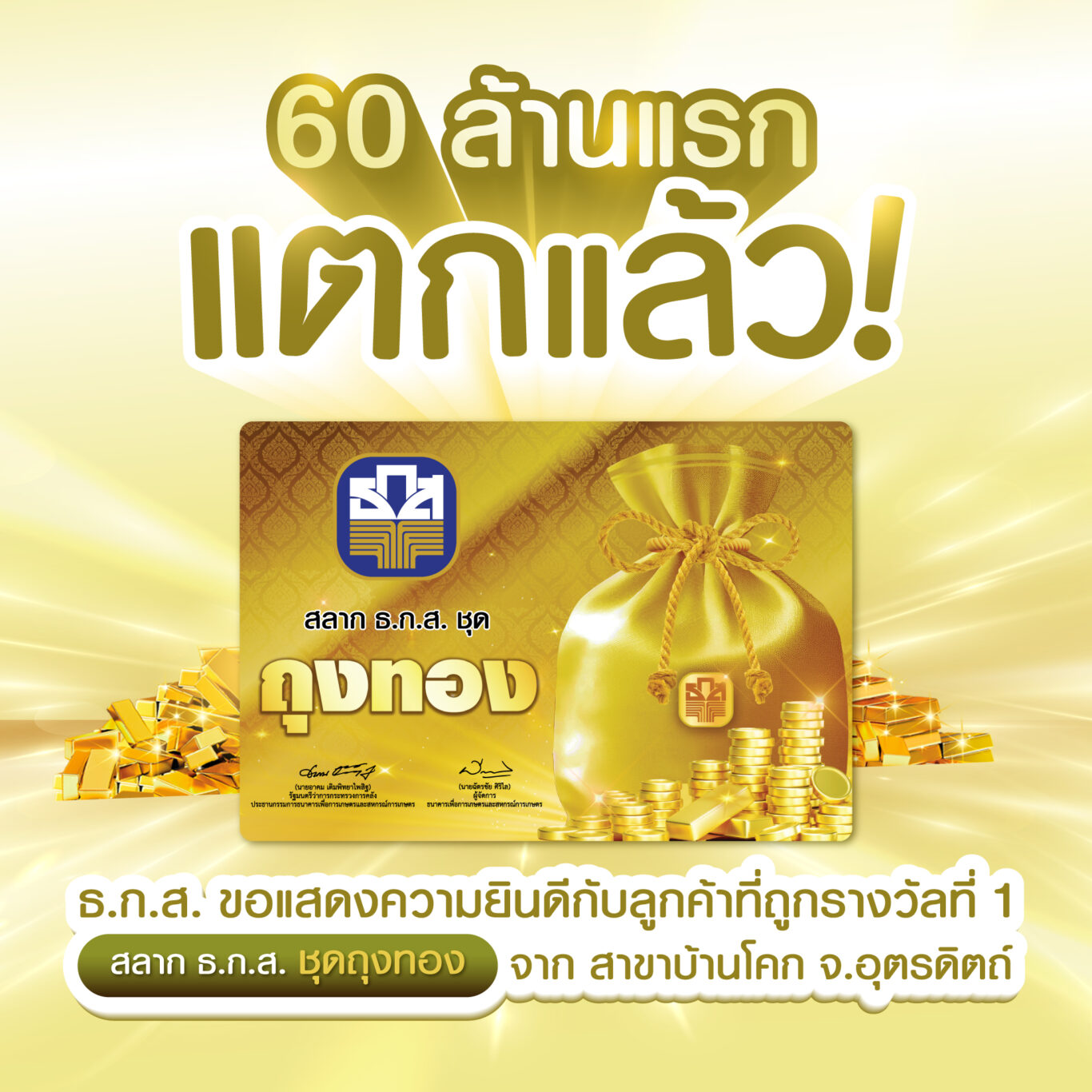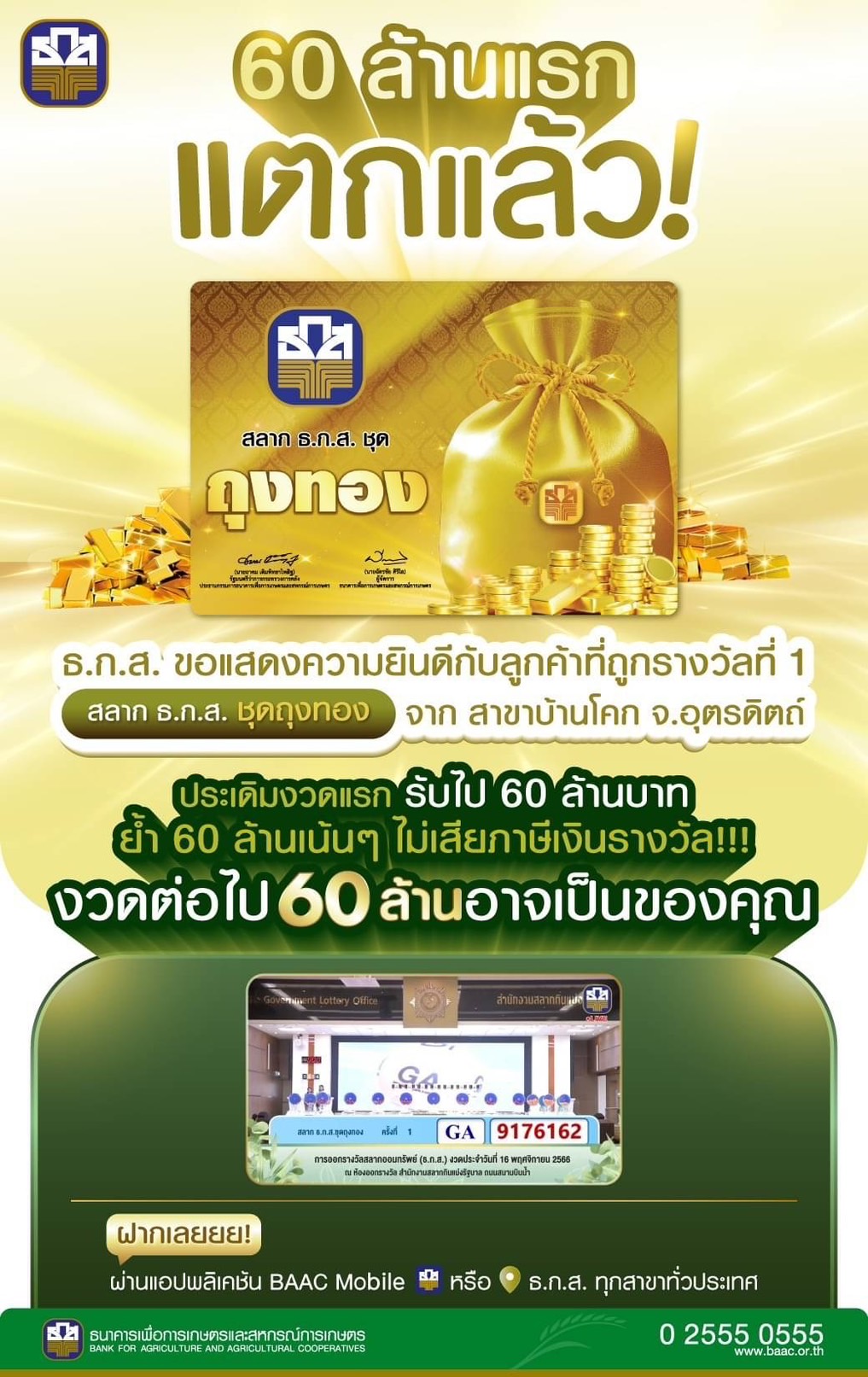 รางวัล Grand Prize 60 ล้าน งวดแรกของสลาก ธ.ก.ส. ชุดถุงทอง ผู้โชคดีเป็นเจ้าของสลากหมายเลข GA9176162 จาก ธ.ก.ส. สาขาบ้านโคก จังหวัดอุตรดิตถ์ เชิญชวนผู้ที่สนใจอย่าช้า รีบออมพร้อมลุ้นรางวัลใหญ่และรางวัลอื่น ๆ รวมมูลค่ากว่า 77 ล้านบาททุกงวด รีบซื้อก่อนหมด ผ่านแอปพลิเคชัน BAAC Mobile และ ธ.ก.ส. ทุกสาขา