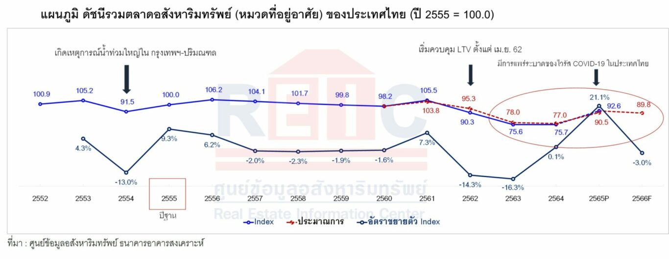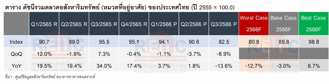 ศูนย์ข้อมูลอสังหาริมทรัพย์ คาดว่า ภาพรวมดัชนีรวมตลาดอสังหาริมทรัพย์ (หมวดที่อยู่อาศัย) ในปี 2566 มีแนวโน้มที่จะปรับตัวลงจากปี 2565 เล็กน้อย โดยจะปรับลงมาอยู่ที่ 89.8 จุด หรือลดลง ประมาณร้อยละ -3.0 สำหรับกรณีฐาน (Base Case) แต่หากมีปัจจัยบวกที่ดีกว่าที่คาดไว้อาจจะมีการปรับเพิ่มมาอยู่ที่ระดับ 98.8 หรือ ขยายตัวได้ถึงร้อยละ 6.7 (Best Case) ในทางตรงข้าม หากมีปัจจัยที่ส่งผลรุนแรงกว่าที่คาดไว้ อาจจะปรับตัวลดมาอยู่ที่ระดับ 80.8 หรือลดลงร้อยละ -12.7 (Worst Case) (ดูตารางที่ 1 และแผนภูมิที่ 3)