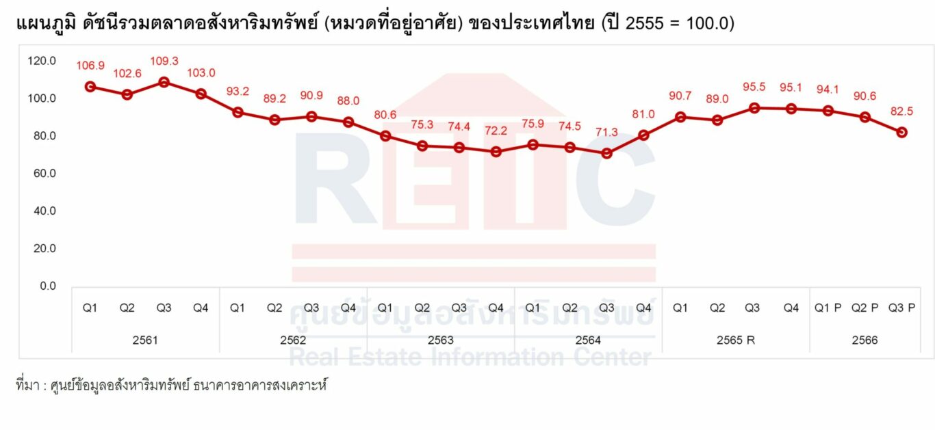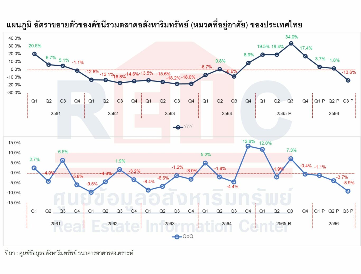 ศูนย์ข้อมูลอสังหาริมทรัพย์ ธนาคารอาคารสงเคราะห์ รายงานดัชนีรวมตลาดอสังหาริมทรัพย์ (หมวดที่อยู่อาศัย) ของประเทศไทย ในภาพรวมของ ไตรมาส 3 ปี 2566 มีค่าดัชนีเท่ากับ 82.5 พบว่า มีการปรับตัวลดลงเมื่อเทียบกับไตรมาสก่อนหน้า (QoQ) ร้อยละ -8.9 อีกทั้งพบว่าลดต่อเนื่องมาจากไตรมาส 2 ปี 2566 และลดลงร้อยละ -13.6 เมื่อเทียบกับช่วงเวลาเดียวกันของปีก่อน (YoY) (ดูตารางที่ 1 แผนภูมิที่ 1 และแผนภูมิที่ 2) โดยด้านผลิตภัณฑ์มวลรวมในประเทศไทย (GDP) ไตรมาส 3 ปี 2566 ขยายตัวร้อยละ 1.5 ชะลอตัวลงจากร้อยละ 1.8 ในไตรมาส 2 ปี 2566 คาดว่าอาจเป็นผลจากภาวะเศรษฐกิจชะลอตัว และเป็นผลจากการส่งออกรวมชะลอตัวลงจากการส่งออกสินค้าที่ลดลง