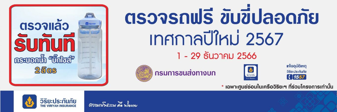 บริษัท วิริยะประกันภัย จำกัด (มหาชน) ร่วมกับ กรมการขนส่งทางบก จัดกิจกรรม “ตรวจรถฟรี ขับขี่ปลอดภัย” เพื่อรณรงค์ด้านความปลอดภัยทางถนนและอำนวยความสะดวกให้แก่ประชาชนที่เดินทางไกลช่วงเทศกาลปีใหม่ 2567 ซึ่งบริษัทฯ มุ่งส่งเสริมการป้องกันและลดอุบัติเหตุบนท้องถนน ด้วยการสร้างความตระหนักรู้ให้กับผู้ใช้รถใช้ถนนเล็งเห็นความสำคัญของการตรวจเช็คความพร้อมของสภาพรถยนต์ก่อนออกเดินทางทุกครั้ง พร้อมให้บริการตรวจสภาพรถยนต์เบื้องต้นฟรี จำนวน 20 รายการ หลังตรวจเสร็จรับทันทีกระบอกน้ำ “บิ๊กไซส์” ขนาด 2 ลิตร ณ ศูนย์ซ่อมมาตรฐานวิริยะประกันภัย ในพื้นที่กรุงเทพฯ และปริมณฑล จำนวน 31 แห่ง ระหว่างวันที่ 1 – 29 ธันวาคม 2566