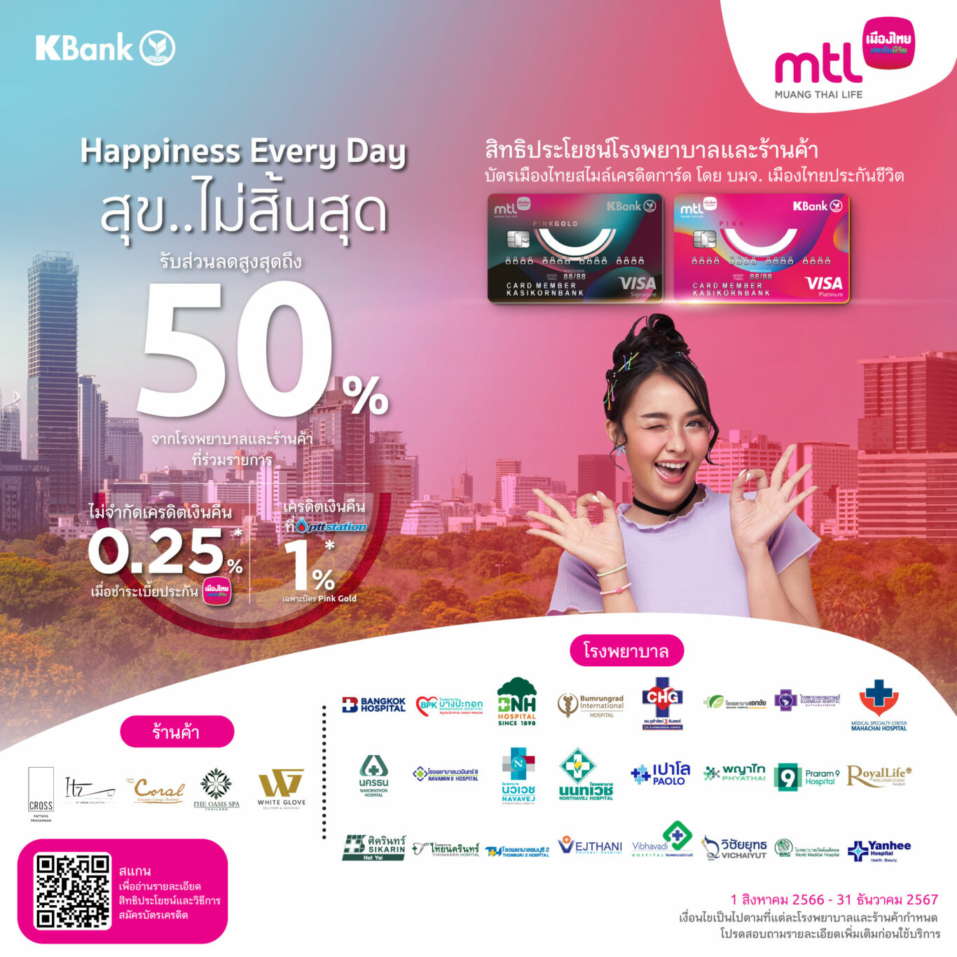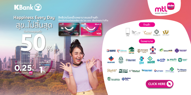 นายสาระ ล่ำซำ ประธานเจ้าหน้าที่บริหาร บริษัท เมืองไทยประกันชีวิต จำกัด (มหาชน) เปิดเผยว่า เมืองไทยประกันชีวิตร่วมกับธนาคารกสิกรไทย ตอกย้ำนโยบายการสนับสนุนในการดูแลสุขภาพแบบครบวงจรให้ตรงตามไลฟ์สไตล์ของลูกค้า มอบสิทธิประโยชน์ Happiness Every Day สุข..ไม่สิ้นสุด สำหรับผู้ถือบัตรเมืองไทยสไมล์เครดิตการ์ดระดับ Pink และ Pink Gold ด้วยสิทธิพิเศษและส่วนลดสูงสุดถึง 50% จากหลากหลายพันธมิตรชั้นนำด้านสุขภาพทั่วประเทศ