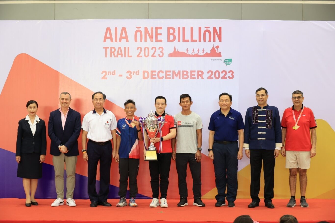 โดยในพิธีมอบรางวัลแก่ทีมผู้ชนะ AIA One Billion Trail 2023 มีผู้บริหารระดับสูงจากกลุ่มบริษัทเอไอเอ ซึ่งได้เดินทางมาร่วมวิ่งเทรล ให้เกียรติขึ้นกล่าวเปิดงานและมอบรางวัลแก่ทีมผู้ชนะ ประกอบด้วย นายสจ๊วต เอ สเปนเซอร์ ประธานเจ้าหน้าที่ฝ่ายการตลาด กลุ่มบริษัทเอไอเอ และ นายตัน ฮาค เลห์ ประธานเจ้าหน้าที่บริหารระดับภูมิภาค