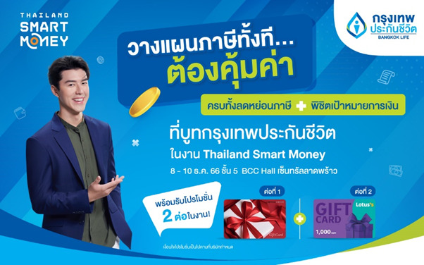 วางแผนการเงิน-ลดหย่อนภาษี ครบรอบด้านพร้อมรับโปรโมชั่นสุดคุ้ม ในเทศกาลการเงิน-การลงทุน “Thailand Smart Money” กรุงเทพฯ ครั้งที่ 14 ที่บูทกรุงเทพประกันชีวิต ชั้น 5 บีซีซี ฮอลล์ ศูนย์การค้าเซ็นทรัล ลาดพร้าว ระหว่างวันที่ 8-10 ธันวาคม 2566 และสามารถติดตามรายละเอียดเพิ่มเติมของแบบประกันต่างๆ ได้ที่เว็บไซต์กรุงเทพประกันชีวิต www.bangkoklife.com หรือติดต่อ Call Center โทร. 02-777-8888