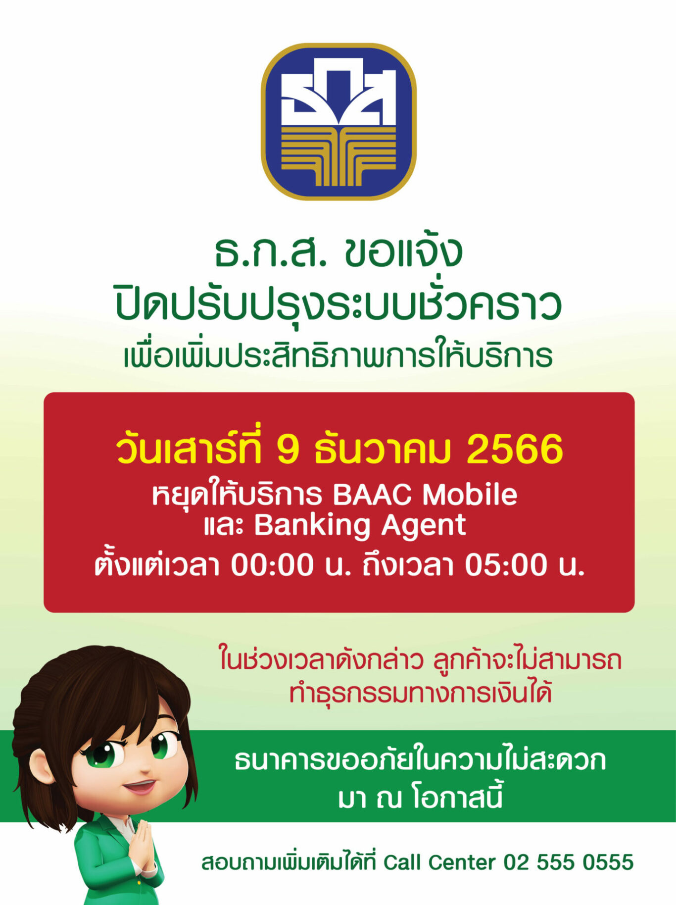 ธนาคารเพื่อการเกษตรและสหกรณ์การเกษตร (ธ.ก.ส.) แจ้งหยุดบริการธุรกรรมทุกช่องทางชั่วคราว ได้แก่ แอปพลิเคชัน BAAC Mobile และระบบ Banking Agent ในวันที่ 9 ธันวาคม 2566 ตั้งแต่เวลา 00.00 น. จนถึงเวลา 05.00 น. รวม 5 ชั่วโมง เพื่อปรับปรุงและเพิ่มประสิทธิภาพระบบการให้บริการและรองรับธุรกรรมที่มีปริมาณมากขึ้นในอนาคต โดยลูกค้าจะไม่สามารถทำธุรกรรมผ่านแอปพลิเคชัน BAAC Mobile และระบบ Banking Agent ได้ในช่วงเวลาดังกล่าว อย่างไรก็ตาม ธ.ก.ส. ขอขอบพระคุณ และขออภัยในความไม่สะดวกมา ณ ที่นี้