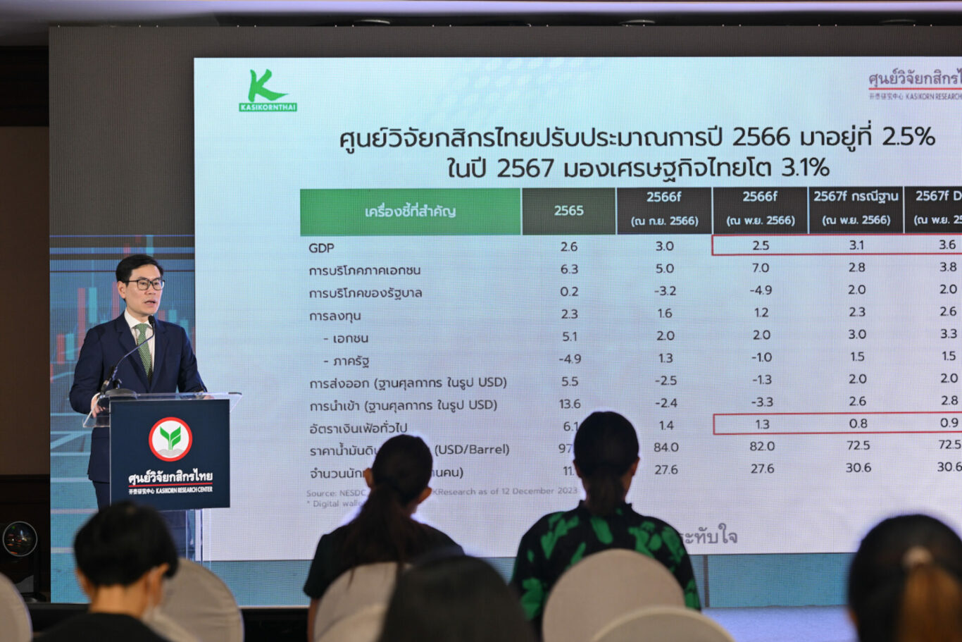 ศูนย์วิจัยกสิกรไทย ปรับลดประมาณการเศรษฐกิจไทยปี 2566 ลงมาอยู่ที่ 2.5 % จาก 3.0% เนื่องจากเศรษฐกิจไทยยังได้รับผลกระทบจากการที่เศรษฐกิจโลกชะลอตัว โดยเฉพาะเศรษฐกิจจีนที่ยังคงเผชิญกับปัญหาในภาคอสังหาริมทรัพย์อยู่