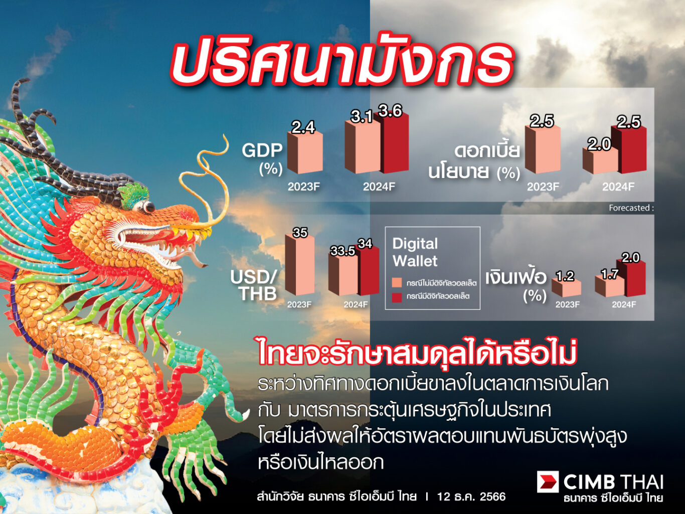 ดร.อมรเทพ จาวะลา ผู้ช่วยกรรมการผู้จัดการใหญ่ ผู้บริหารสำนักวิจัย ธนาคาร ซีไอเอ็มบี ไทย เปิดเผยว่า สถานการณ์เศรษฐกิจโลกผันผวน ซับซ้อน และคาดเดายากขึ้นเรื่อยๆ การจะทำให้เศรษฐกิจไทยฟื้นตัวและเติบโต ท่ามกลางภูมิรัฐศาสตร์โลกที่เต็มไปด้วยความเสี่ยงและความท้าทาย ต้องอาศัยนโยบายกระตุ้นเศรษฐกิจที่เหมาะสม ปี 2567 จึงเปรียบได้กับ ปริศนามังกร ที่มีปริศนาต้องแก้ไขฝ่าด่านเต็มไปหมด คำถามที่ยากที่สุดคือ ไทยจะรักษาสมดุลอย่างไร ระหว่างทิศทางดอกเบี้ยขาลงในตลาดการเงินโลก กับมาตรการกระตุ้นเศรษฐกิจในประเทศ โดยไม่ส่งผลให้อัตราผลตอบแทนพันธบัตรพุ่งสูงหรือเงินไหลออก
