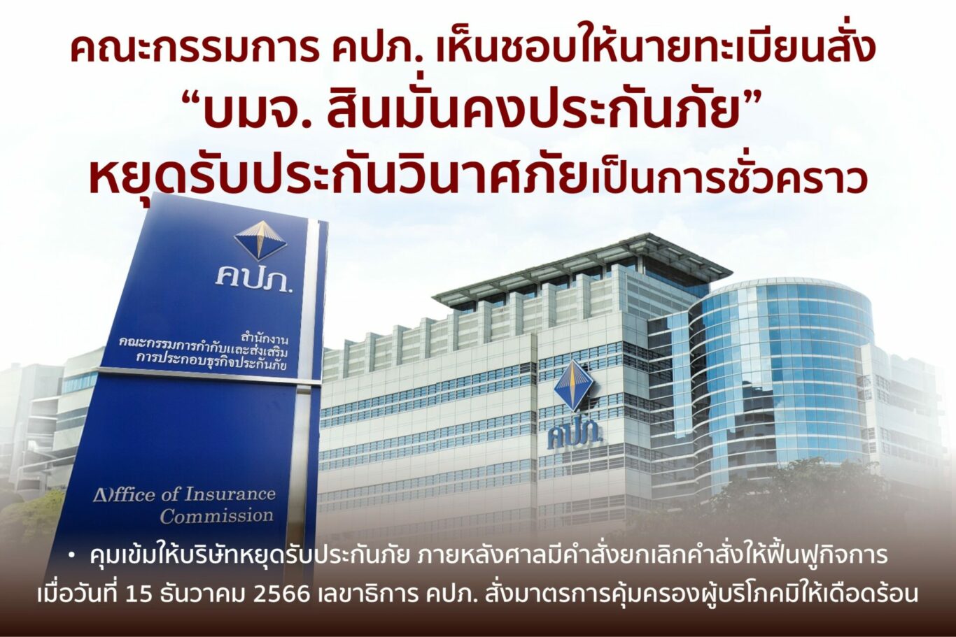 คณะกรรมการ คปภ. เห็นชอบให้นายทะเบียนสั่ง “บมจ. สินมั่นคงประกันภัย” หยุดรับประกันวินาศภัยเป็นการชั่วคราว