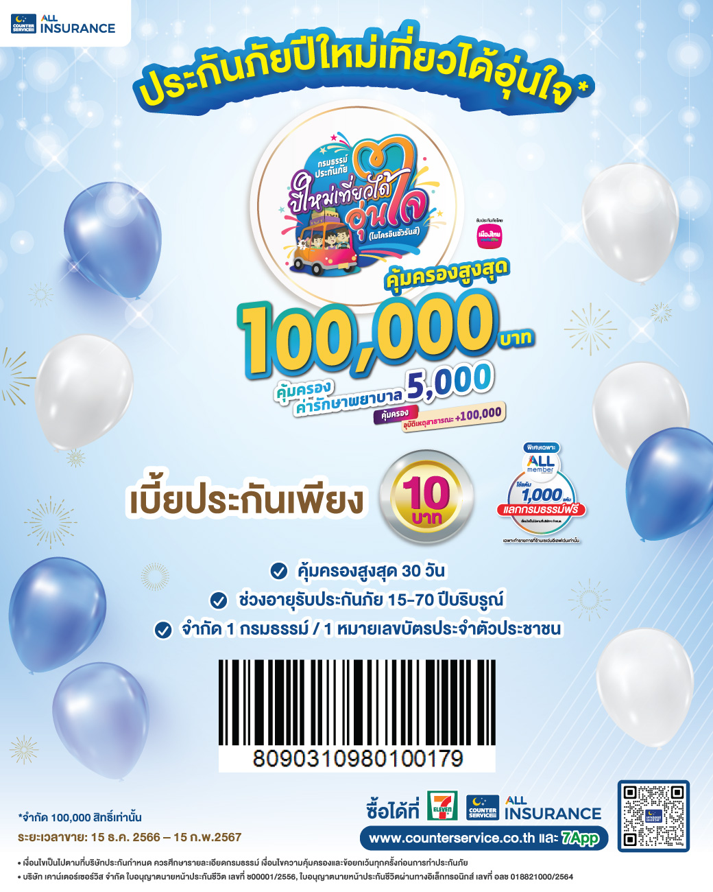 นายสาระ กล่าวว่า เมืองไทยประกันชีวิตร่วมกับเคาน์เตอร์เซอร์วิส ส่งมอบความห่วงใยให้กับประชาชน รับสิทธิ์ความคุ้มครองฟรี “กรมธรรม์ประกันภัยกลุ่มปีใหม่เที่ยวได้อุ่นใจ (ไมโครอินชัวรันส์)” เมื่อมาใช้บริการฝาก-ถอนเงินสด, บริการยืนยันตัวตนเพื่อเปิดบัญชีธนาคาร, บริษัทหลักทรัพย์ และบริษัทหลักทรัพย์จัดการกองทุน ที่ร้านสะดวกซื้อเซเว่นอีเลฟเว่น ตั้งแต่วันที่ 24 ธันวาคม 2566 จนถึงวันที่ 15 กุมภาพันธ์ 2567 (จำนวนสิทธิ์ 100,000 สิทธิ์) และสำหรับลูกค้าและประชาชนทั่วไปที่สนใจสามารถรับความคุ้มครองได้ง่ายๆ เพียงแจ้งความประสงค์ต่อพนักงานเพื่อซื้อกรมธรรม์ประกันภัยกลุ่มปีใหม่เที่ยวได้อุ่นใจ (ไมโครอินชัวรันส์) ที่จุดให้บริการเคาน์เตอร์เซอร์วิสในร้านสะดวกซื้อเซเว่นอีเลฟเว่น เปิดทุกวันตลอด 24 ชั่วโมง กว่า 14,500 สาขาทั่วประเทศ หรือใช้แต้ม ALL Member ในการแลกสิทธิ์แทนเงินสด หรือทำรายการบนเว็บไซต์ www.counterservice.co.th, Counter Service Application รวมถึง 7APP เบี้ยประกันภัย 10 บาท พร้อมใช้บัตรประชาชนเพื่อแสดงตัวตน ชำระเงิน รับสลิปยืนยันการทำรายการ ซึ่งจะระบุวันเริ่มต้นคุ้มครองและวันสิ้นสุดความคุ้มครองอย่างชัดเจน โดยสามารถซื้อได้ตั้งแต่วันที่ 15 ธันวาคม 2566 จนถึงวันที่ 15 กุมภาพันธ์ 2567 (จำนวนสิทธิ์ 100,000 สิทธิ์)