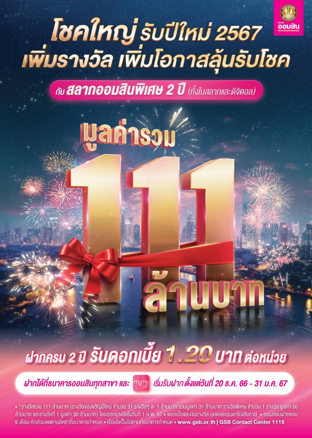 นายวิทัย รัตนากร ผู้อำนวยการธนาคารออมสิน เปิดเผยว่า ธนาคารได้จัดแคมเปญสลากออมสินชุดใหญ่มอบเป็นขวัญปีใหม่ให้แก่คนไทยกับสลากออมสินพิเศษ 2 ปี โดยมอบโชคลุ้นเงินรางวัลมูลค่าเงินรวม 111 ล้านบาท พร้อมร่วมเฉลิมฉลองในโอกาสธนาคารออมสินครบรอบ 111 ปี ในปี 2567 ที่จะถึงนี้ โดยยังคงมีเงินรางวัลพิเศษ 50 ล้านบาท เนื่องจากเสียงตอบรับดีจากครั้งที่แล้ว และเพื่อเป็นการเพิ่มโอกาสในการถูกรางวัลและตอบแทนลูกค้าประชาชนได้กว้างขึ้นจึงเพิ่มรางวัล 1 ล้านบาท อีกถึง 31 รางวัล พร้อมยังลุ้นรางวัลที่ 1 มูลค่า 30 ล้านบาทได้เช่นเดิม โดยออกรางวัลพร้อมกันในวันที่ 1 กุมภาพันธ์ 2567 สำหรับผู้ฝากสลากออมสินพิเศษ 2 ปี ตั้งแต่วันที่ 20 ธ.ค.66 – 31 ม.ค.67 ผ่าน 2 ช่องทาง คือ แบบใบสลาก ฝากได้ที่ธนาคารออมสินทุกสาขาทั่วประเทศ และ สลากดิจิทัล ฝากได้ที่แอป MyMo เมื่อฝากครบกำหนด 2 ปี จะได้รับดอกเบี้ยอีก 1.20 บาท/หน่วย ดอกเบี้ยและเงินรางวัลได้รับยกเว้นภาษี ทั้งนี้ ธนาคารจะประกาศผลการออกรางวัลผ่านทางเว็บไซต์ www.gsb.or.th