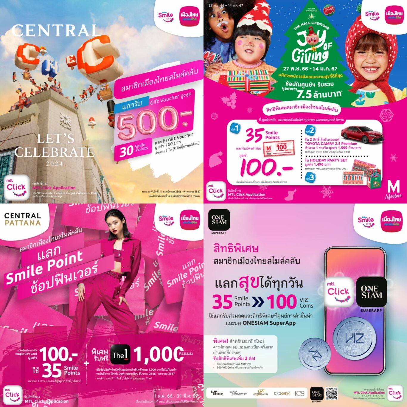 THE MALL LIFESTORE JOY OF GIVING ต่อที่ 1 ใช้คะแนนสมสะ 35 Smile Points แลกรับบัตรกำนัลศูนย์การค้ามูลค่า 100 บาท จำกัด 15 สิทธิ์ / ท่าน / สัปดาห์  กดรับสิทธิ์ผ่าน MTL Click Application แสดงรหัสรับสิทธิ์ ณ จุดแลกรับของสมนาคุณของศูนย์การค้า ภายใน 30 นาที ระยะเวลารับสิทธิ์ 27 พฤศจิกายน 2566 –             14 มกราคม 2567 ต่อที่ 2 ช้อปในศูนย์การค้า ครบทุก 2,000 บาท รับ 2 สิทธิ์ (ลูกค้าทั่วไป 1 สิทธิ์) ลุ้นรางวัลใหญ่ CAMRY 2.5 PREMIUM มูลค่า 1,599,000 บาท จำนวน 1 รางวัล ระยะเวลารับสิทธิ์ 27 พฤศจิกายน 2566 –  7 มกราคม 2567 ต่อที่ 3 ช้อปในศูนย์การค้า เพียง 7,000 บาทขึ้นไป (ปกติ 8,000 บาท) รับ Holiday Party Set (Placement 4 ชิ้น Coaster 4 ชิ้น ) มูลค่า 1,490 บาทจำกัด 1 สิทธิ์ / ท่าน / ตลอดรายการ ระยะเวลารับสิทธิ์  27 พฤศจิกายน 2566 – 14 มกราคม 2567 สถานที่รับสิทธิ์ต่อที่ 2-3 ณ จุดแลกรับของสมนาคุณของศูนย์การค้า  เดอะมอลล์ทุกสาขา โดยแสดงรูปบัตรสมาชิกเมืองไทยสไมล์คลับผ่าน MTL Click Application รูปแบบอิเล็กทรอนิกส์เพื่อรับสิทธิ์ (สงวนสิทธิ์งดเว้นการถ่ายภาพหน้าจอ)