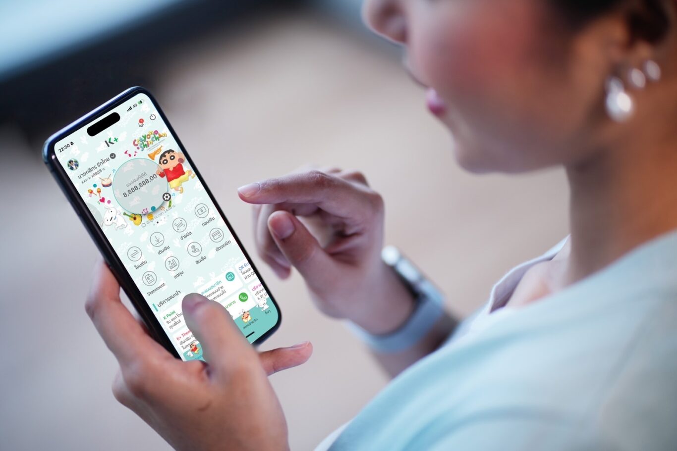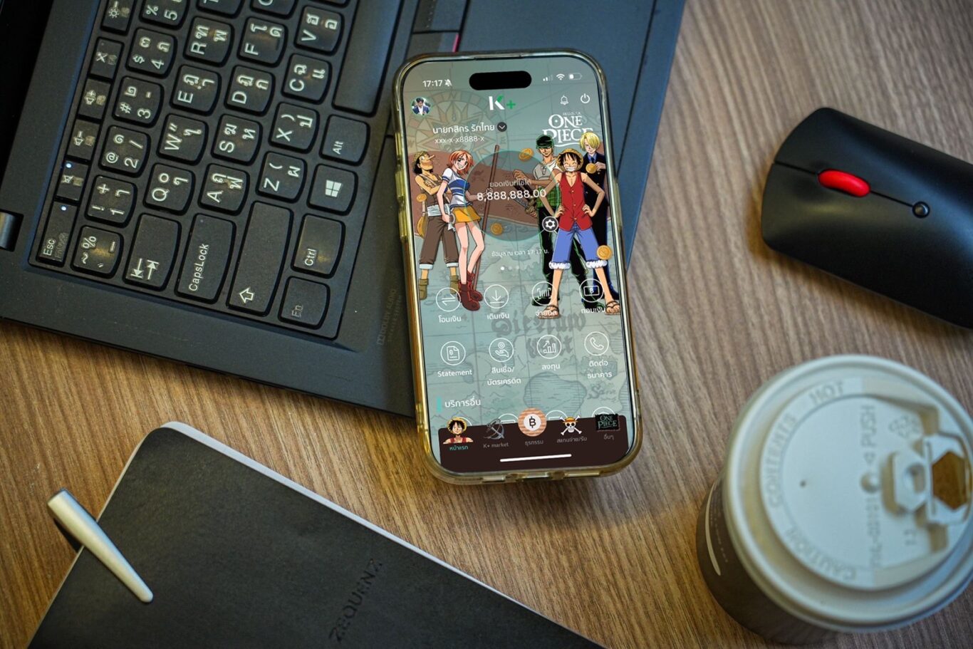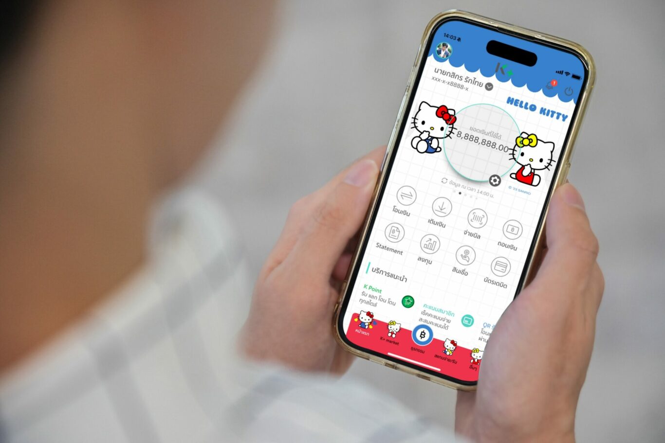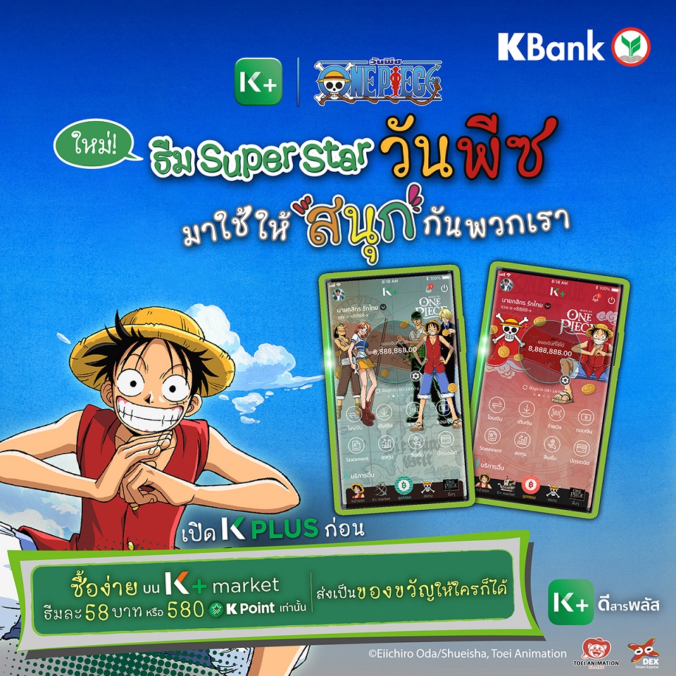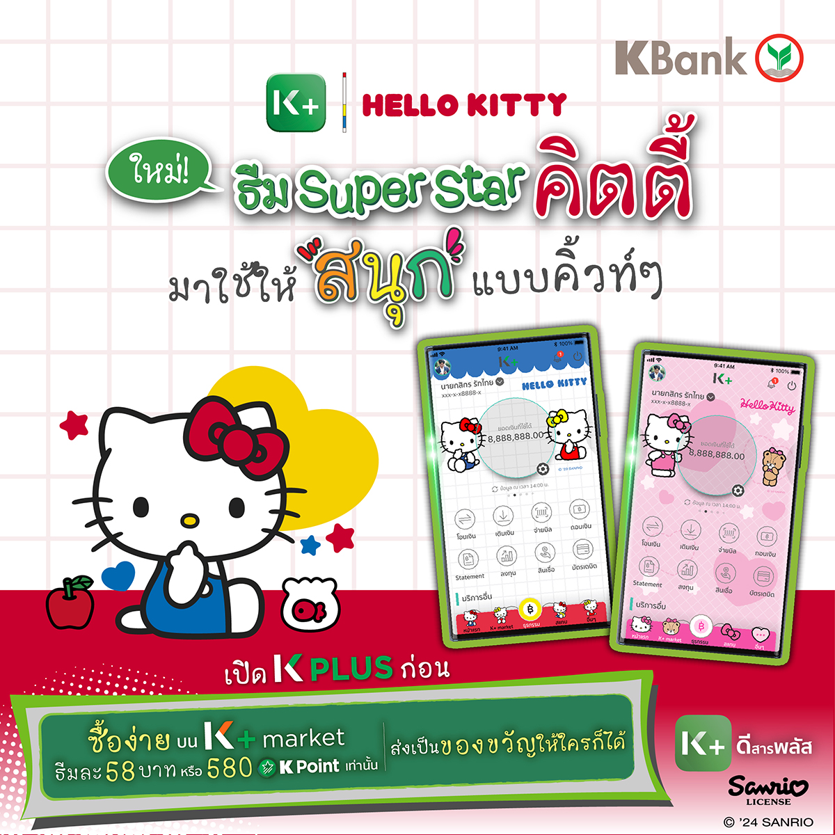 ธนาคารกสิกรไทย เปิดตัวธีม K PLUS สร้างความเซอร์ไพรส์ใหม่ ด้วยผลงานคอลแลปกับ 4 คาแรคเตอร์ขวัญใจทั่วโลก ได้แก่ “เฮลโล คิตตี้” (Hello Kitty) คาแรคเตอร์ฮิตตลอดกาล, “วันพีซ” (One Piece) อนิเมะญี่ปุ่นชื่อดัง, ชินจัง การ์ตูนคาแรคเตอร์สุดกวน และ “วิกเกิล วิกเกิล” (wiggle wiggle) ไลฟ์สไตล์แบรนด์สุดน่ารักชื่อดังจากเกาหลี