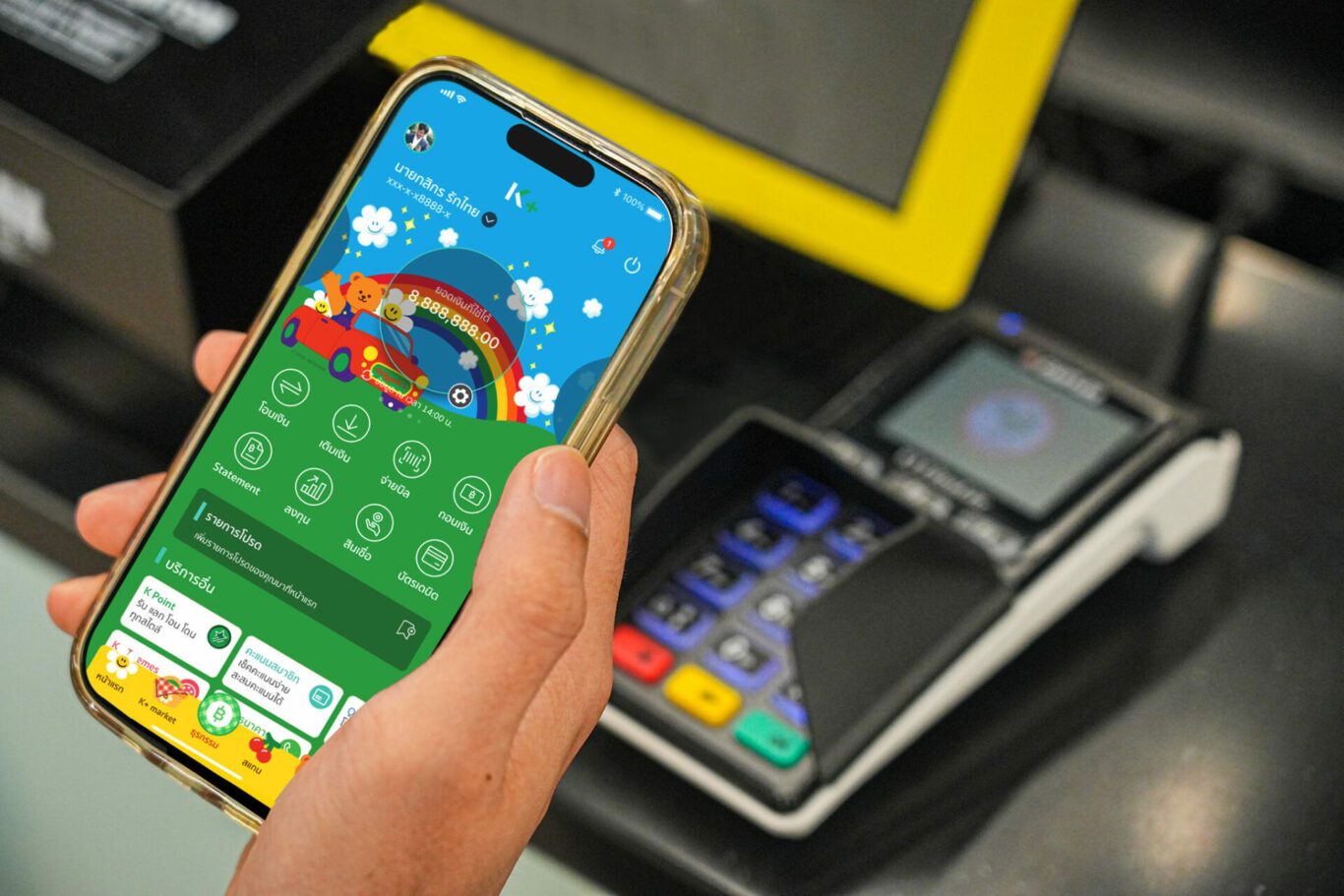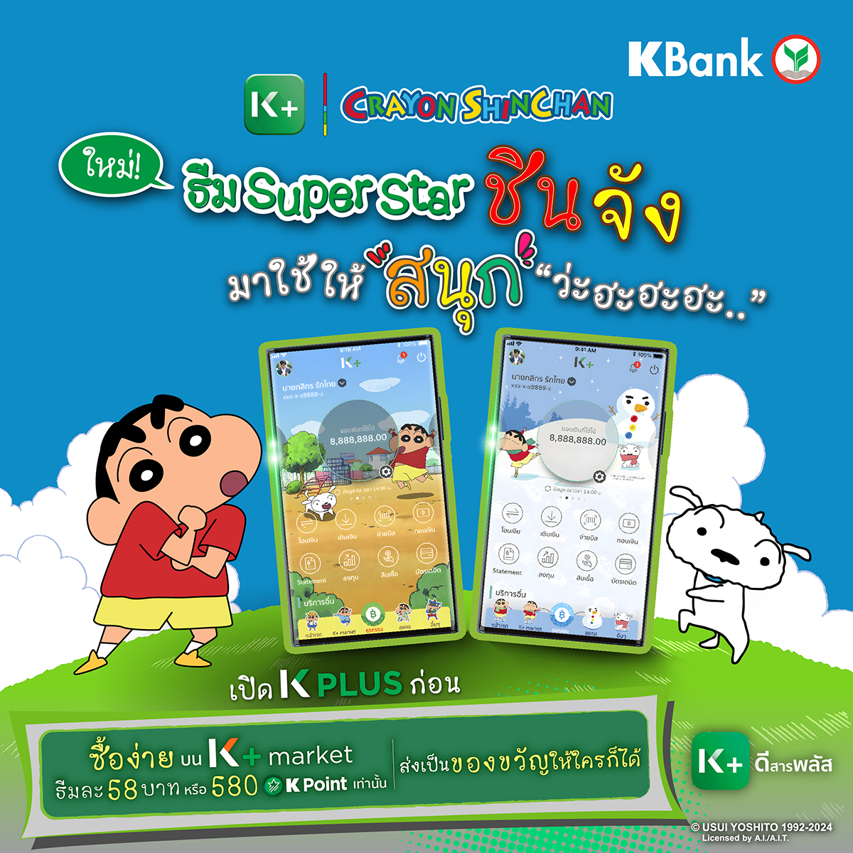 ลูกค้าสามารถเติมสีสันให้การใช้งาน K PLUS ให้สนุกได้ทุกวัน ด้วยลวดลายธีมและ e-Slip ครบเซ็ต มีให้เลือกทั้ง 4 คาแรคเตอร์ กดซื้อได้ที่ K+ market ในราคาธีมละ 58 บาท หรือใช้คะแนนสะสม K Point ซื้อเพียง 580 คะแนน อีกทั้งยังสามารถกดฟีเจอร์ “Send Gift” เพื่อส่งธีมพิเศษนี้เป็นของขวัญให้กับเพื่อนที่ใช้ K PLUS ได้ด้วย