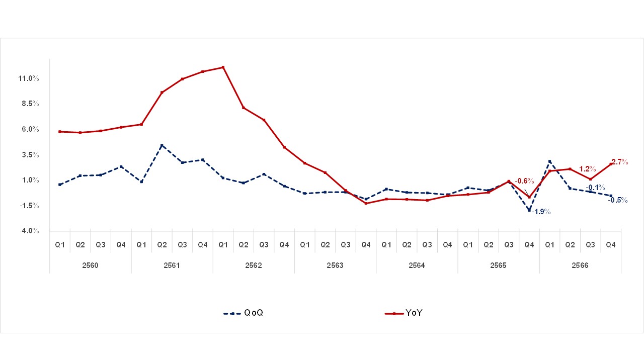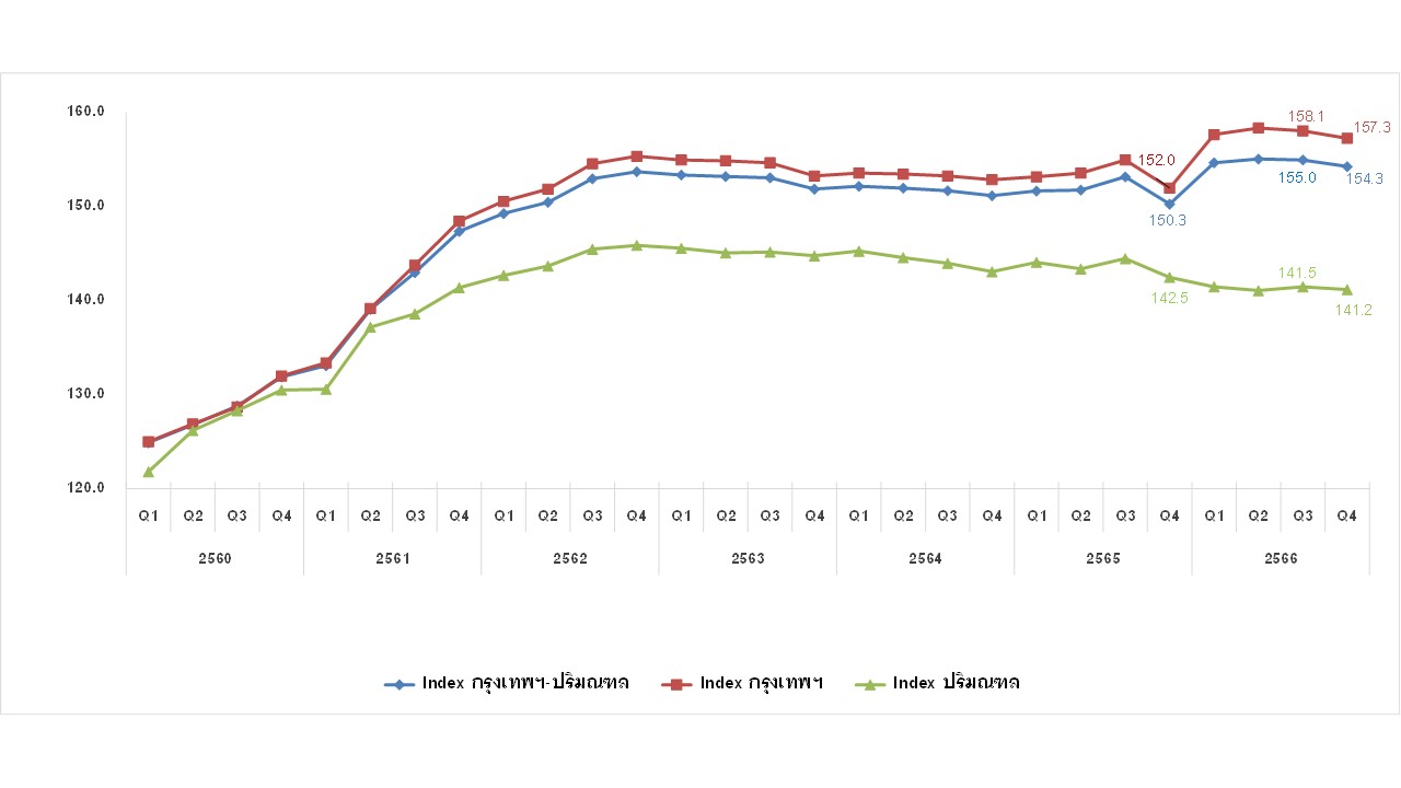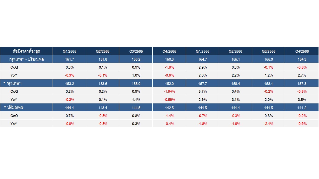 ศูนย์ข้อมูลอสังหาริมทรัพย์ ธนาคารอาคารสงเคราะห์ (REIC) รายงานดัชนีราคาห้องชุดใหม่ที่อยู่ระหว่างการขายในกรุงเทพฯ-ปริมณฑล ไตรมาส 4 ปี 2566 พบว่ามีค่าดัชนีเท่ากับ 154.3 จุด เพิ่มขึ้นร้อยละ 2.7 เมื่อเทียบกับช่วงเวลาเดียวกันของปีก่อน (YoY) ซึ่งเป็นผลจากการเพิ่มขึ้นของดัชนีราคาห้องชุดในพื้นที่กรุงเทพฯถึงร้อยละ 3.5 เมื่อเทียบกับช่วงเดียวกันของปี 2565 (YoY) แต่ภาพรวมเมื่อเทียบกับไตรมาสก่อนหน้า (QoQ) ลดลงร้อยละ -0.5 ซึ่งเป็นการลดลงต่อเนื่องจากไตรมาสที่แล้ว เพื่อกระตุ้นขายและยอดโอนในช่วงปลายปี ขณะที่รายการส่งเสริมการขายห้องชุดใหม่ที่อยู่ระหว่างการขายในไตรมาส 4 ปี 2566 ส่วนใหญ่ร้อยละ 36.3 เป็นของแถม ซึ่งลดลงจากไตรมาสก่อนหน้าที่มีสัดส่วนร้อยละ 38.4
