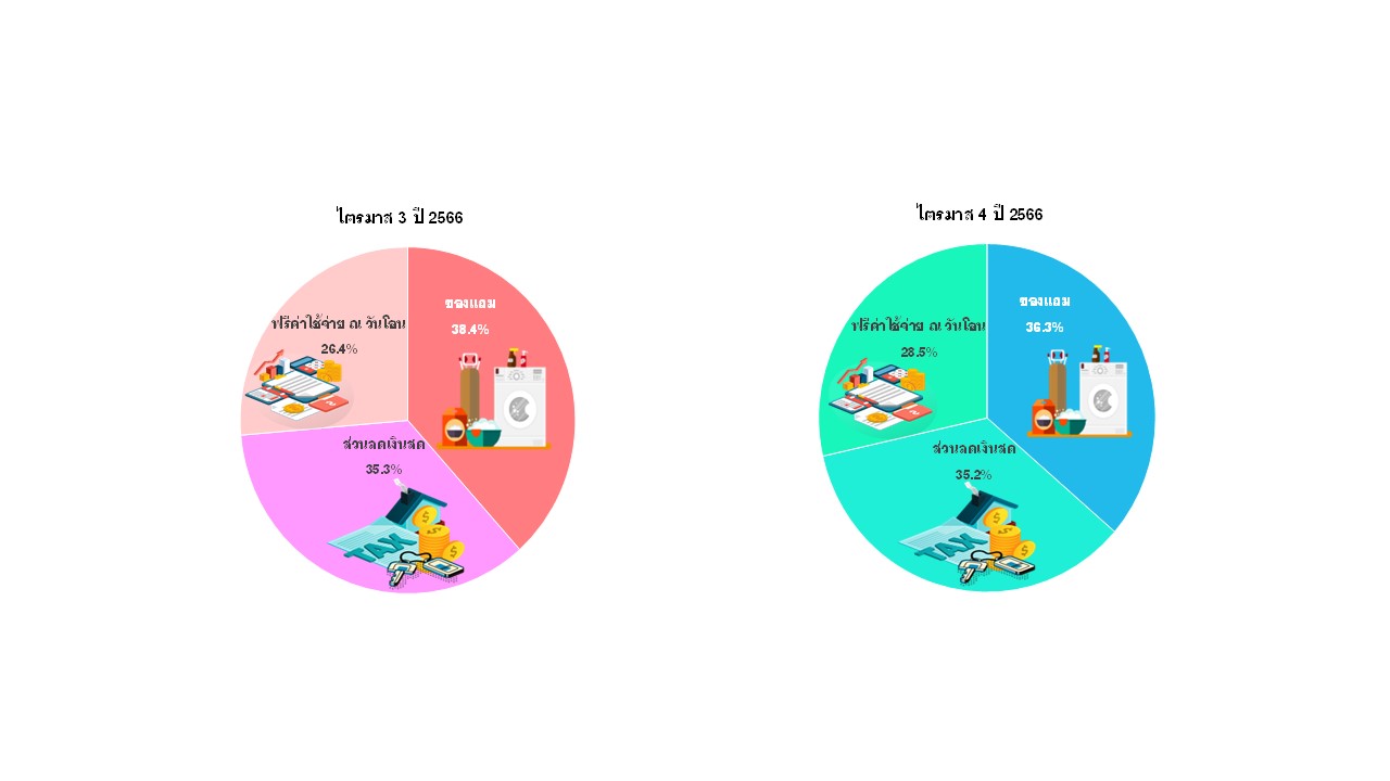สำหรับรายการส่งเสริมการขายห้องชุดใหม่ที่อยู่ระหว่างการขายในไตรมาสนี้พบว่า ส่วนใหญ่ร้อยละ 36.3 เป็นของแถม ซึ่งลดลงจากไตรมาสก่อนหน้าที่มีสัดส่วนร้อยละ 38.4 สำหรับรูปแบบการส่งเสริมการขายเป็นการให้ส่วนลดเงินสด มีสัดส่วนร้อยละ 35.2 ลดลงจากไตรมาสก่อนหน้า ซึ่งมีสัดส่วนร้อยละ 35.3 และการให้ส่วนลดฟรีค่าใช้จ่ายในวันโอนกรรมสิทธิ์ มีสัดส่วนร้อยละ 28.5 เพิ่มขึ้นจากไตรมาสก่อนหน้าซึ่งมีสัดส่วนร้อยละ 26.4