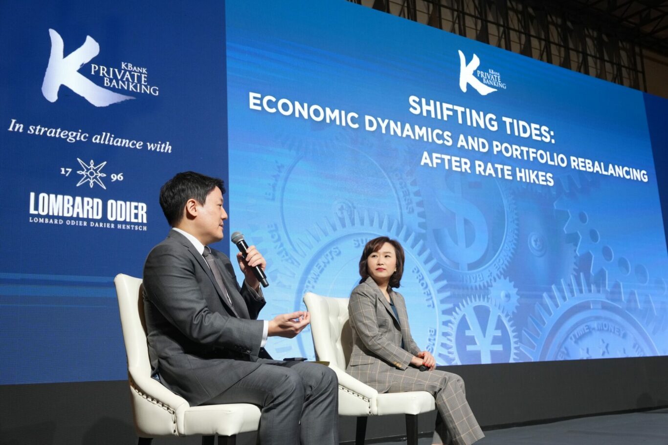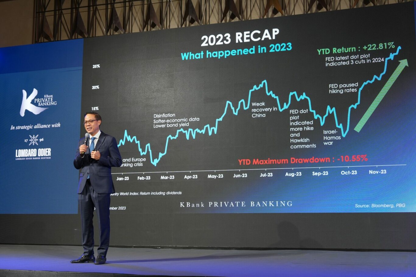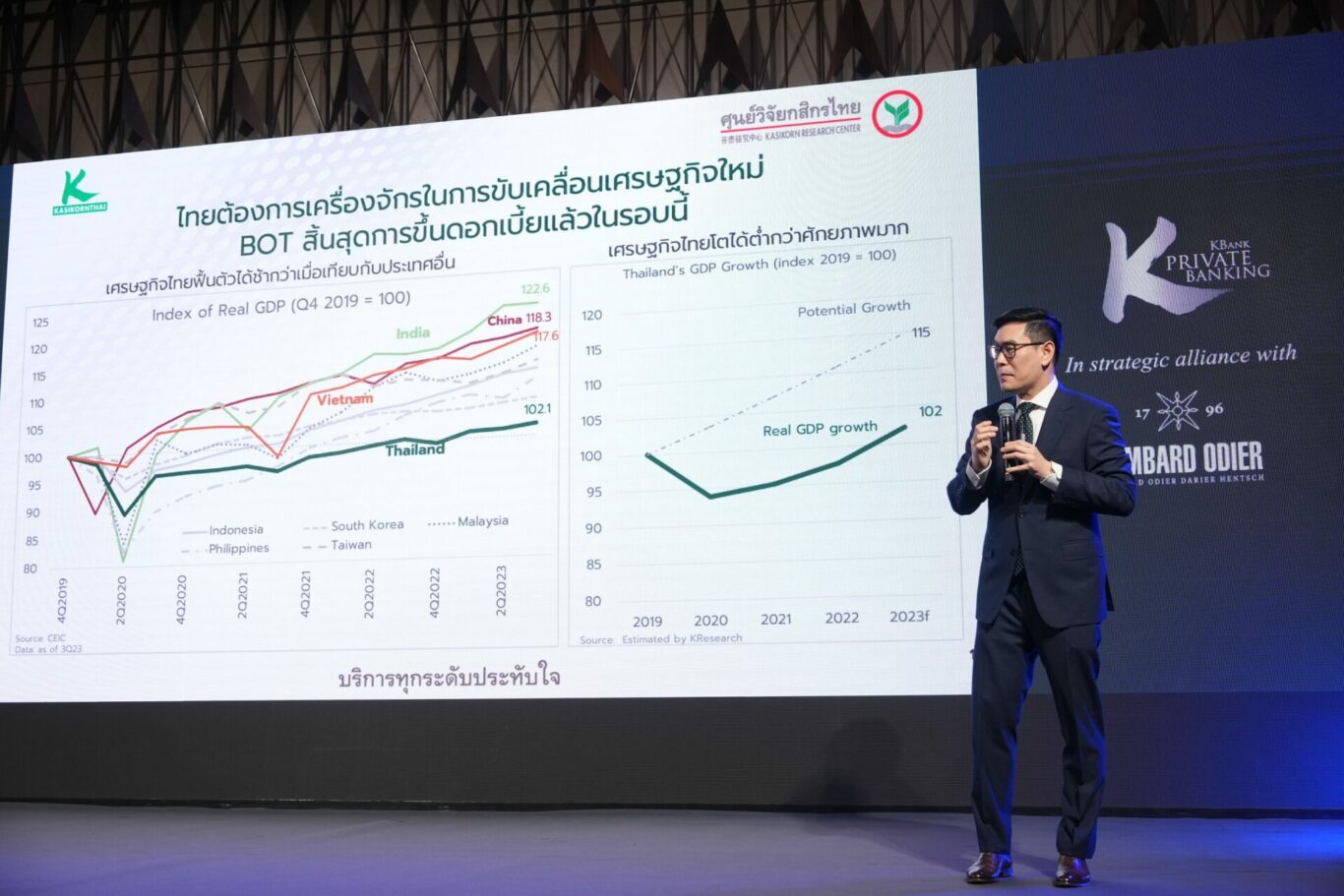 KBank Private Banking ร่วมกับ Lombard Odier พันธมิตรทางธุรกิจไพรเวทแบงก์ระดับโลกจากสวิตเซอร์แลนด์ จัดงานสัมมนาในหัวข้อ “Shifting Tides : Economic Dynamics And Portfolio Rebalancing After Rate Hikes” เพื่อประเมินเศรษฐกิจโลกปี 2567 โดยคาดว่าจะเติบโตต่อได้ แต่ในอัตราที่ชะลอลง ชี้จะเกิดความเปลี่ยนแปลงทางเศรษฐกิจ หลังการหยุดขึ้นดอกเบี้ยและการทยอยปรับตัวลดลงในช่วงมีนาคมนี้ ในขณะที่ยังคงต้องจับตาเรื่องภูมิรัฐศาสตร์ อย่างการเลือกตั้งสหรัฐฯ แนะแบ่งเงินลงทุนเพื่อสร้างผลตอบแทนในระยะยาวโดยเน้นลงทุนแบบ Risk-based ที่กระจายลงทุนในสินทรัพย์หลักทั่วโลกผ่าน ALL ROADS Series พร้อมกระจายลงทุนในตราสารหนี้ หุ้น และการลงทุนทางเลือก ด้านศูนย์วิจัยกสิกรไทยมองไทยต้องการเครื่องจักรในการขับเคลื่อนเศรษฐกิจใหม่ เพื่อให้เศรษฐกิจไทยเติบโตได้ต่อ คาด GDP ไทยปีนี้โต 3.1%