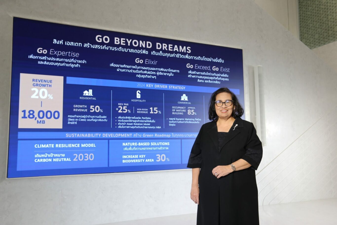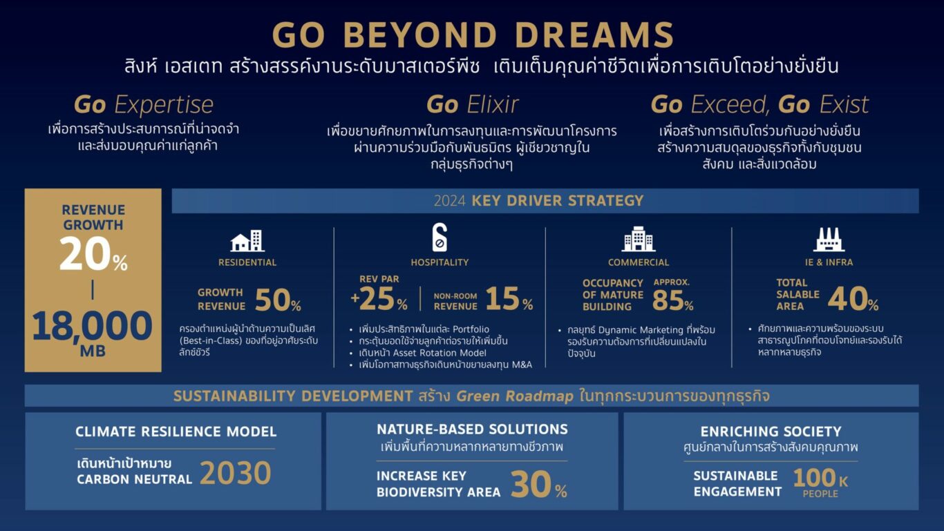 “โดยในปี 2567 นี้ เราตั้งเป้ารายได้รวมของบริษัทให้เติบโตขึ้นสูงถึง 20% หรือมีมูลค่ารวมอยู่ที่ 18,000 ล้านบาทผ่านแนวคิด Go Beyond Dream ที่ใช้ 3 แนวทางสนับสนุนสำคัญในการขับเคลื่อนการเติบโตครั้งนี้ ได้แก่ 1) Go Expertise การสร้างซินเนอร์จีจากความชำนาญของทีมระหว่าง 4 กลุ่มธุรกิจ โดยดึงเอาจุดแข็งและความชำนาญที่แตกต่างและโดดเด่นของแต่ละธุรกิจเพื่อเกื้อหนุนกันและกัน เพื่อการสร้างประสบการณ์ที่น่าจดจำและส่งมอบคุณค่าแก่ลูกค้า 2) Go Elixir การผนึกกำลังกับพันธมิตรใหม่ เพื่อขยายโอกาสทางธุรกิจและการลงทุน 3) Go Exceed, Go Exit ความมุ่งมั่นในการพัฒนาอย่างยั่งยืน SDG13 Climate Change สู่การเป็นองค์กร Carbon Neutrality ของสิงห์ เอสเตท ในปี 2573 เพื่อสร้างความสมดุลของธุรกิจทั้งกับชุมชุน สังคมและสิ่งแวดล้อม” นางฐิติมา เผย