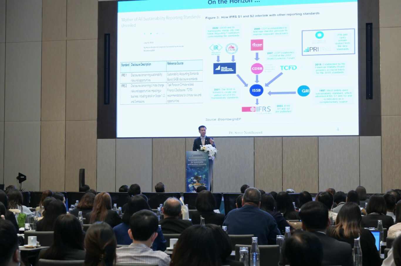ดร.เสรี นนทสูติ รองกรรมการผู้จัดการอาวุโส มูลนิธิสถาบันวิจัยและพัฒนาองค์กรภาครัฐและกรรมการสหประชาชาติว่าด้วยสิทธิทางเศรษฐกิจ สังคม และวัฒนธรรมผู้ทรงคุณวุฒิด้านกฎหมายของสำนักงานคณะกรรมการกำกับและส่งเสริมการประกอบธุรกิจประกันภัย (คปภ.) ปาฐกถาพิเศษ หัวข้อ “Navigating Human Capital and Culture Transformation for ESG-Driven Society”