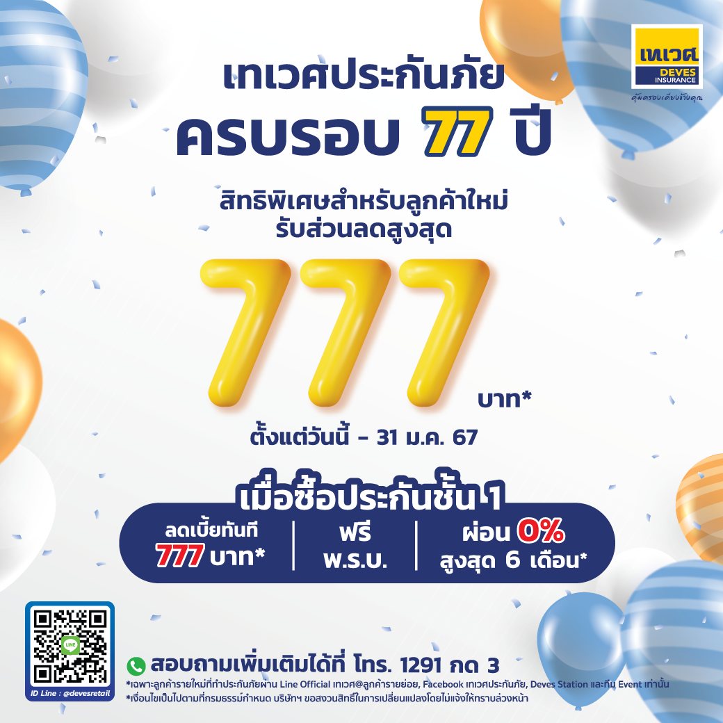 เทเวศประกันภัย ฉลองครบรอบ 77 ปี เสนอสิทธิพิเศษสำหรับลูกค้าใหม่ ที่ทำประกันผ่านช่องทาง Facebook Fanpage เทเวศประกันภัย, Line Official เทเวศประกันภัย และ Line Official เทเวศลูกค้ารายย่อย คุ้ม 3 ต่อ เมื่อซื้อประกันชั้น 1 ต่อที่ 1 รับส่วนลดเบี้ยประกันภัยทันที 777 บาท ต่อที่ 2 ฟรี พ.ร.บ. และต่อที่ 3 ผ่อน 0% สูงสุด 6 เดือน ตั้งแต่วันนี้ – 31 มกราคม 2567