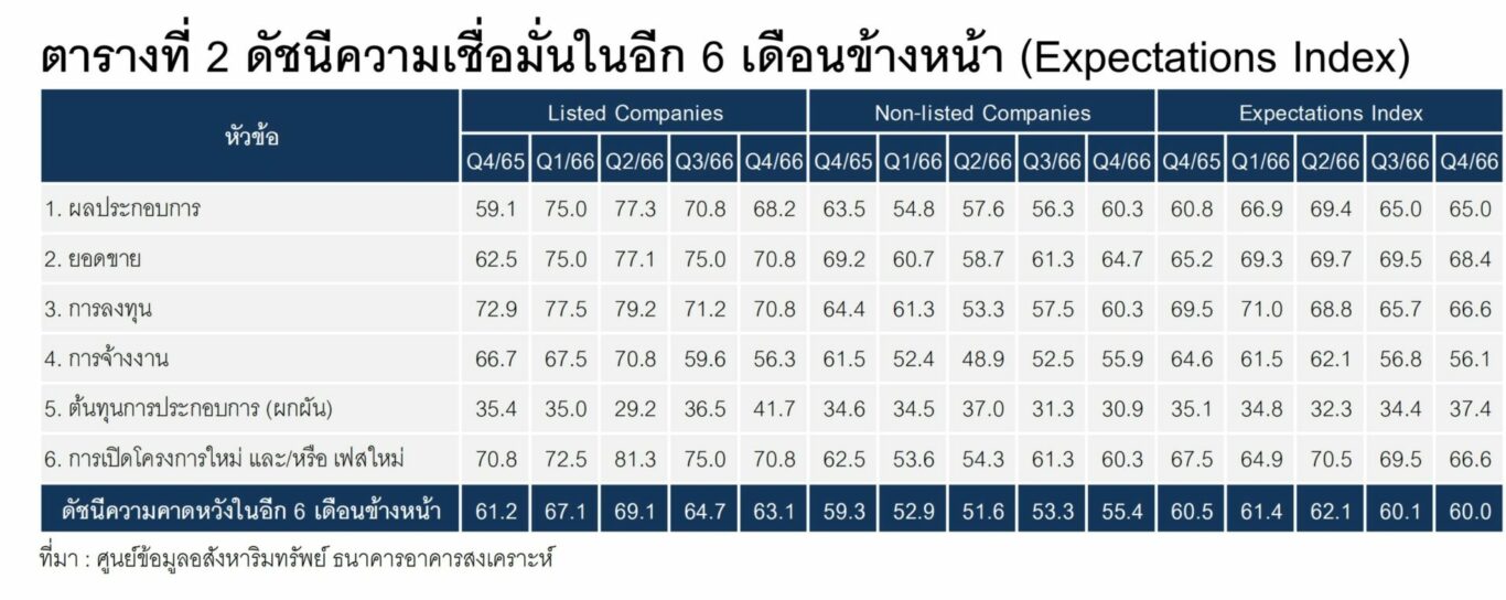 ขณะที่ผู้ประกอบการกลุ่ม Non-listed Companies ในไตรมาส 4 ปี 2566 มีค่าดัชนีความเชื่อมั่นที่ระดับ 46.8 เพิ่มขึ้นจากไตรมาสก่อนหน้าซึ่งอยู่ที่ระดับ 42.3 ซึ่งยังคงต่ำกว่าค่ากลางที่ระดับ 50.0 แสดงให้เห็นว่าผู้ประกอบการรายย่อยกลุ่ม Non-listed Companies ยังคงมีความกังวลต่อปัจจัยลบต่าง ๆ เช่นเดียวกับกลุ่ม Listed Companies ทั้งนี้ ความเชื่อมั่นของผู้ประกอบการ Non-listed Companies ที่เพิ่มขึ้นอย่างชัดเจนคือด้านผลประกอบการที่เพิ่มขึ้นเป็นระดับ 50.0
