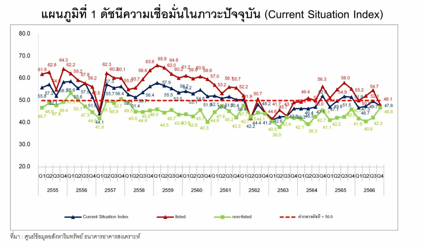 เมื่อจำแนกความเชื่อมั่นตามกลุ่มผู้ประกอบการฯ พบว่า ความเชื่อมั่นในภาวะปัจจุบันของผู้ประกอบการกลุ่ม Listed Companies ในไตรมาส 4 ปี 2566 มีค่าดัชนีเท่ากับ 48.1 น้อยกว่าไตรมาสก่อนหน้าที่มีค่าดัชนีระดับ 54.7 และต่ำกว่าค่ากลางที่ระดับ 50.0 แสดงให้เห็นว่าผู้ประกอบการกลุ่ม Listed Companies มีความกังวลต่อธุรกิจในภาวะปัจจุบัน โดยเฉพาะในด้านผลประกอบการที่ลดลงไปที่ระดับ 36.4 จากไตรมาสก่อนที่ระดับ 56.8 และด้านการเปิดโครงการใหม่ และ/หรือเฟสใหม่ลดลงไปที่ 56.3 จากไตรมาสก่อนที่ระดับ 65.4