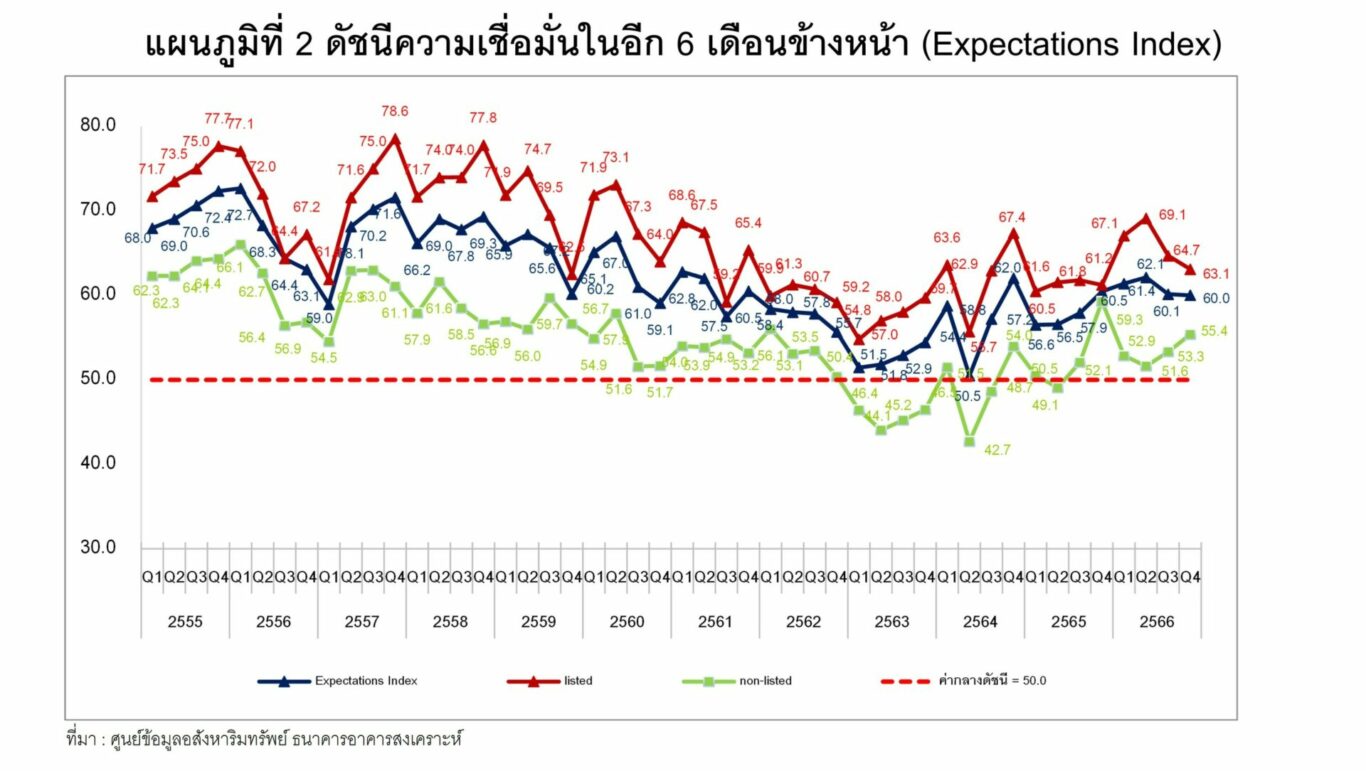 สำหรับดัชนีความเชื่อมั่นของผู้ประกอบการธุรกิจพัฒนาที่อยู่อาศัยในกรุงเทพฯ – ปริมณฑล ในภาพรวมอีก 6 เดือนข้างหน้า (Expectations Index) อยู่ที่ระดับ 60.0 โดยลดลงเล็กน้อยจากไตรมาสก่อนหน้าซึ่งอยู่ที่ในระดับ 60.1 ซึ่งยังคงมีค่าดัชนีสูงกว่าค่ากลางที่ระดับ 50.0 สะท้อนให้เห็นว่าผู้ประกอบการยังคงมีความเชื่อมั่นในมุมมองเชิงบวกต่อสถานการณ์ธุรกิจอสังหาริมทรัพย์ในอีก 6 เดือนข้างหน้า หากพิจารณาในรายด้านพบว่า ด้านที่มีระดับความเชื่อมั่นสูงขึ้นกว่าไตรมาสก่อนประกอบด้วย ด้านการลงทุนเพิ่มขึ้นเป็นระดับ 66.6 หรือเพิ่มขึ้น 0.9 จุด และด้านต้นทุนการประกอบการ (ผกผัน) เพิ่มขึ้นเป็นระดับ 37.4 หรือเพิ่มขึ้น 3.0 จุด ด้านที่มีระดับความเชื่อมั่นเท่าเดิม คือ ด้านผลประกอบการ ที่อยู่ในระดับ 65.0 ด้านที่มีระดับความเชื่อมั่นลดลง ประกอบด้วย ด้านยอดขายลดลงเหลือระดับ 68.4 หรือลดลง -1.1 จุด ด้านการจ้างงานลดลงเหลือระดับ 56.1 หรือลดลง -0.7 จุด และการเปิดตัวโครงการใหม่และ/หรือเฟสใหม่ลดลงเหลือระดับ 66.6 หรือลดลง -2.9 จุด