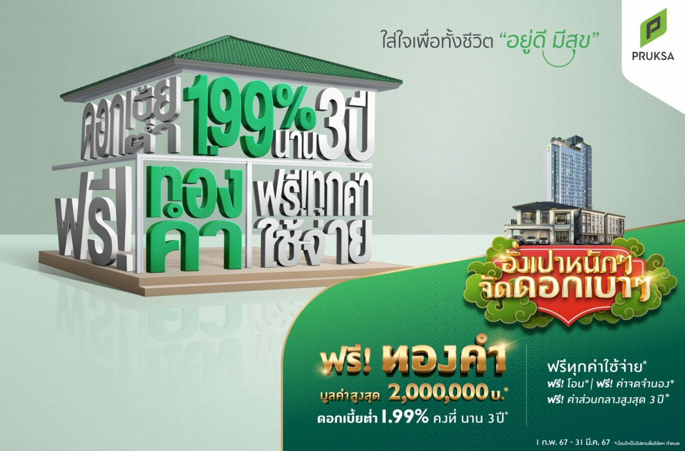 ลูกค้าที่จองหรือทำสัญญาตั้งแต่ 1 กุมภาพันธ์ – 31 มีนาคม 2567 จะได้รับอั่งเปาทองคำมูลค่าสูงสุด 2 ล้านบาท และได้รับดอกเบี้ยคงที่ 1.99% ต่อปี นาน 3 ปี ผ่อนเริ่มต้นเพียงล้านละ 2,500 บาทต่อเดือน ให้วงเงินอนุมัติสูงสุด 110% พิเศษ !!! สำหรับลูกค้าที่เข้าร่วมแคมเปญนี้ ถ้ากู้ไม่ผ่าน พฤกษายินดีคืนเงินทุกกรณี พร้อมรับสิทธิจากโปรโมชั่นพิเศษ ฟรีทั้งค่าโอน ค่าจดจำนอง ค่าส่วนกลาง ค่าประกัน