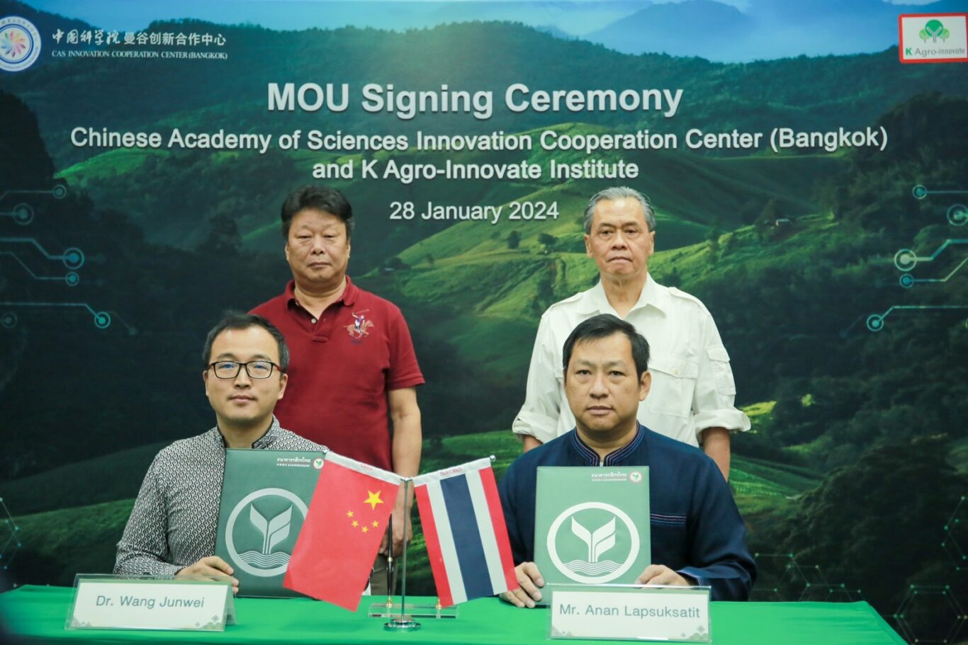 นายอนันต์ ลาภสุขสถิต ประธานสถาบัน เค อะโกรอินโนเวท (K Agro Innovate) ภายใต้มูลนิธิกสิกรไทย และ ศ.ดร. หวาง จุ้นเหวย Executive Director of Chinese Academy of Sciences Innovation Cooperation Center Bangkok (CASICCB) ร่วมพิธีลงนามบันทึกข้อตกลงความร่วมมือเพื่อนำเอาเทคโนโลยีจากประเทศจีนมาร่วมช่วยฟื้นฟูป่าต้นน้ำในโครงการ “น่านแซนด์บอกซ์”
