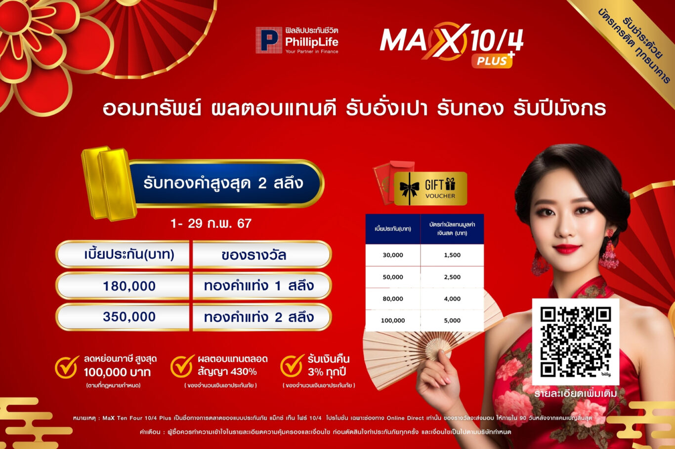 นายธฤทธิ์ พรหมนารถ กรรมการผู้จัดการบริษัท ฟิลลิปประกันชีวิต จำกัด (มหาชน) เปิดตัวแคมเปญพิเศษ ประเดิมเทศกาลตรุษจีนด้วยโปรโมชั่นแจกทองคำสูงสุด 2 สลึง หรือบัตรกำนัลสำหรับแลกซื้อทองคำ* เมื่อซื้อประกันภัยแม็กซ์ เท็น โฟร์ พลัส (10/4) ระหว่างวันที่ 1 – 29 กุมภาพันธ์ 2567 รับเงินคืนแน่นอนที่ 3% ของทุนประกันภัยในทุกสิ้นปีกรมธรรม์ที่ 1-9 และรับอีก 403% ของทุนประกันภัยเมื่อครบกำหนดสัญญาในปีกรมธรรม์ที่ 10 เหมาะสำหรับคนที่ต้องการสร้างวินัยในการออมเงิน-ลดหย่อนภาษี