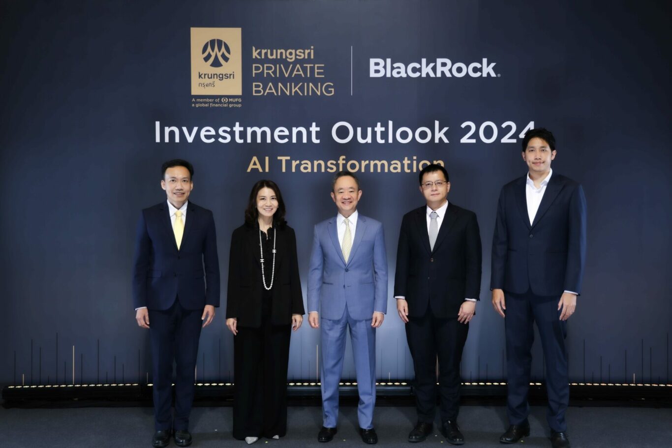 กรุงเทพฯ (7 กุมภาพันธ์ 2567) – กรุงศรี ไพรเวท แบงก์กิ้ง นำโดย นายพงษ์อนันต์ ธณัติไตร (กลาง) ประธานกลุ่มธุรกิจลูกค้ารายย่อยและลูกค้าบุคคล ธนาคารกรุงศรีอยุธยา จำกัด (มหาชน) และ นางสาวกนกวรรณ ศุภนันตฤกษ์ (ที่ 2 จากซ้าย) ประธานคณะเจ้าหน้าที่ด้านเครือข่ายการขาย จับมือ แบล็คร็อค บริษัทหลักทรัพย์จัดการกองทุนชั้นนำของโลก พันธมิตรด้านการบริหารจัดการความมั่งคั่งของกรุงศรี จัดสัมมนาพิเศษ Investment Outlook 2024 & AI Transformation สำหรับลูกค้ากรุงศรี ไพรเวทแบงก์กิ้งโดยเฉพาะ โดยได้รับเกียรติจาก Mr. Ben Bei (ที่ 2 จากขวา) Director of BlackRock ดร.ณภัทร จาตุศรีพิทักษ์ (ขวา) ผู้ก่อตั้งและซีอีโอ ViaLink และ นายวิน พรหมแพทย์ CFA (ซ้าย) ผู้ช่วยกรรมการผู้จัดการใหญ่ ผู้บริหารสายงานลูกค้าไฮเน็ตเวิร์ธ ร่วมเผยมุมมองเศรษฐกิจและการลงทุน พร้อมเจาะลึกเทรนด์ AI ในปี 2024 งานสัมมนาดังกล่าวจัดขึ้นเมื่อเร็วๆ นี้ ณ โรงแรม พาร์ค ไฮแอท กรุงเทพฯ