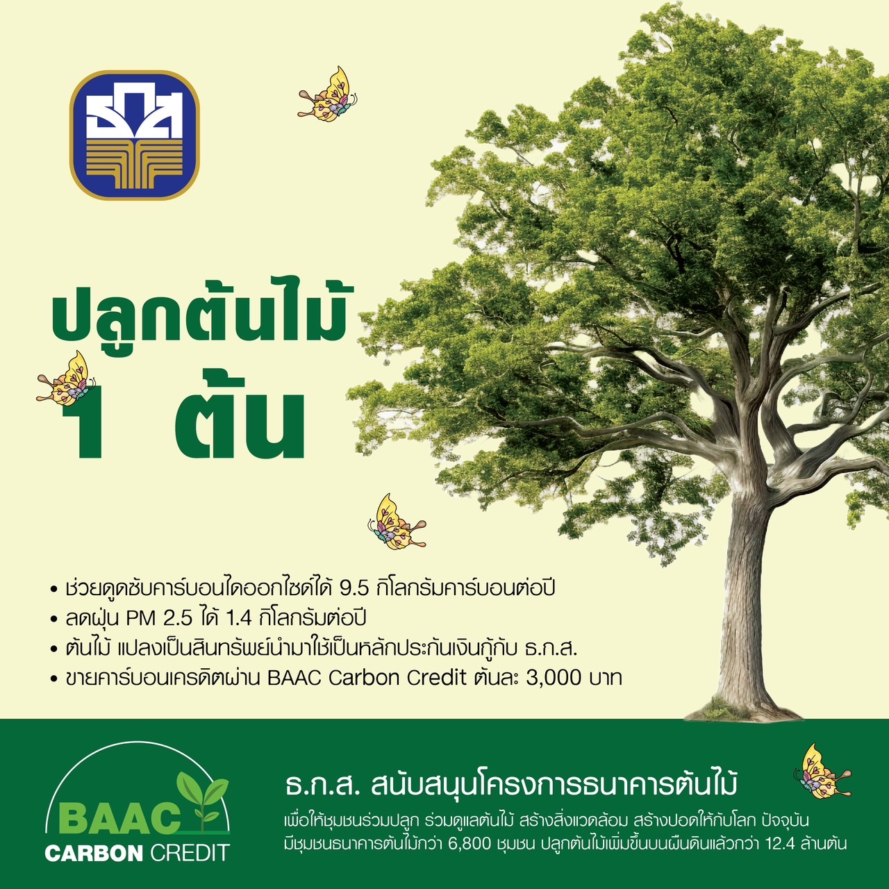 ธ.ก.ส. ผนึกกำลังชุมชนธนาคารต้นไม้บ้านท่าลี่และบ้านแดง จังหวัดขอนแก่น ขับเคลื่อนภารกิจซื้อ – ขายคาร์บอนเครดิตอย่างเป็นทางการ ในโครงการ BAAC Carbon Credit จำนวน 400 ตันคาร์บอน มูลค่ากว่า 1.2 ล้านบาท พร้อมขยายผลการสร้างคาร์บอนเครดิตภาคป่าไม้ไปยังชุมชนธนาคารต้นไม้ ทั้ง 6,800 ชุมชน และหนุนการปลูกป่าเพิ่มอีกปีละ 108,000 ต้น วางเป้าหมายสร้างปริมาณการซื้อ – ขายคาร์บอนเครดิตอีกกว่า 510,000 ตันคาร์บอน ภายใน 5 ปี เชิญชวนหน่วยงานภาครัฐเอกชน ร่วมเป็นส่วนหนึ่งในการทดแทนคุณแผ่นดิน ที่ตอบโจทย์ทั้งด้านธุรกิจ การดูแลรักษาสมดุลสิ่งแวดล้อม การสร้างรายได้ให้ชุมชน และการบรรลุเป้าหมายการปล่อยก๊าซเรือนกระจกสุทธิเป็นศูนย์ของประเทศไทย