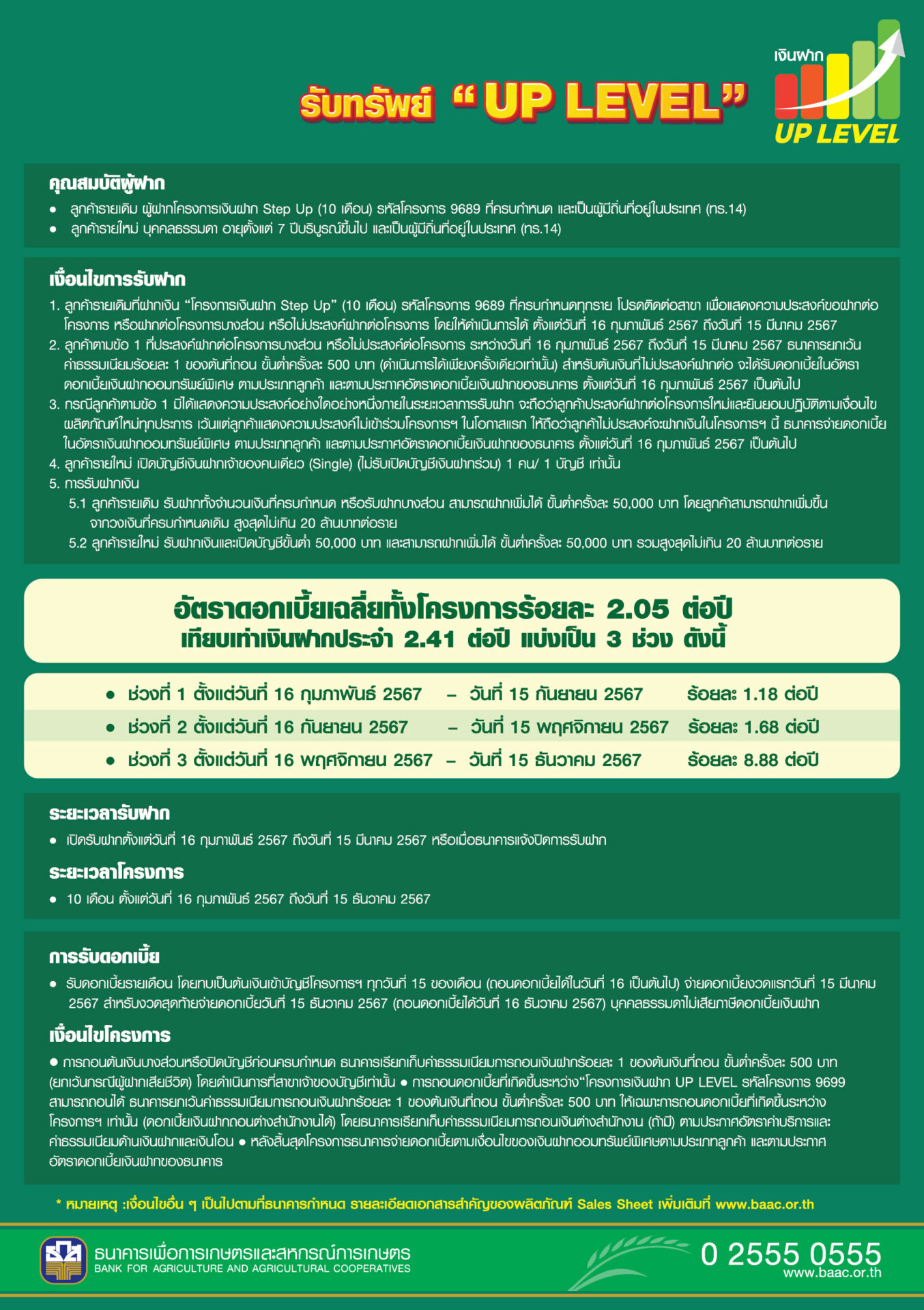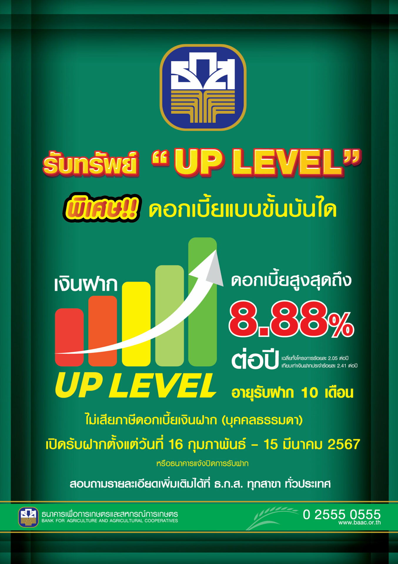 ธ.ก.ส. เพิ่มสิทธิประโยชน์การออมกับ “เงินฝาก UP LEVEL” ฝากขั้นต่ำ 50,000 บาท รับดอกเบี้ยสูงสุด 8.88% ต่อปี