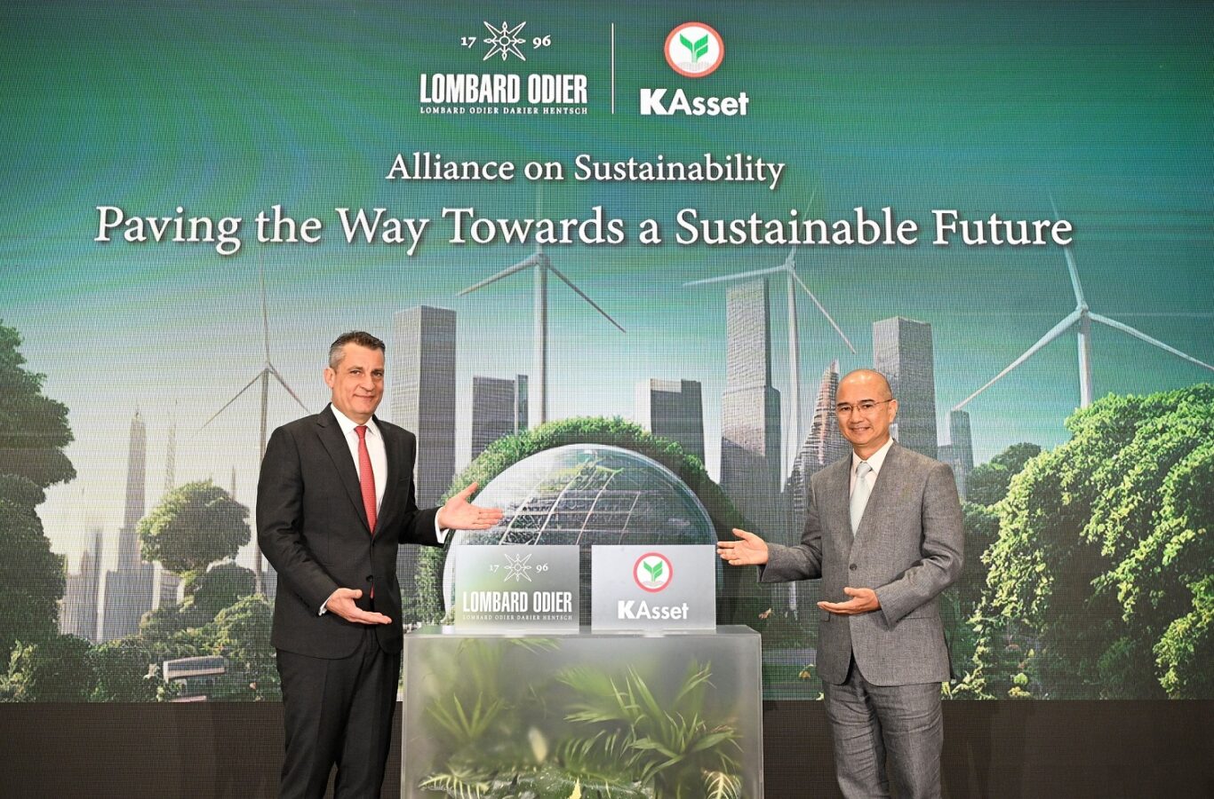 Lombard Odier เป็นสถาบันการเงินที่มีชื่อเสียงระดับโลกจากสวิตเซอร์แลนด์ ปัจจุบันมีทรัพย์สินภายใต้การจัดการมูลค่ารวมกว่า 336 พันล้านดอลลาร์สหรัฐ (ข้อมูล ณ 31 ธ.ค. 66) เน้นกลยุทธ์ในการสร้างผลตอบแทนที่ยั่งยืนแก่ลูกค้าผ่านโซลูชันการลงทุนส่วน KAsset เป็นผู้นำด้านการจัดการลงทุนของไทยที่มีสินทรัพย์ภายใต้การจัดการมูลค่ารวมกว่า 1.50 ล้านล้านบาท (ข้อมูล ณ 31 ม.ค. 67) โดยมุ่งดำเนินธุรกิจโดยคำนึงถึงความโปร่งใส ตลอดจนการมีส่วนร่วมต่อการรับผิดชอบและพัฒนาสังคม ดังนั้น ความร่วมมือด้านการลงทุนอย่างยั่งยืนระหว่าง KAsset และ Lombard Odier จึงเป็นอีกบทพิสูจน์ถึงความมุ่งมั่นของ KAsset ที่ต้องการส่งเสริมให้ผู้ลงทุนไทยตระหนักและเห็นความสำคัญกับการลงทุนที่ยั่งยืน และเป็นอีกแรงผลักดันในการขับเคลื่อนผู้มีส่วนได้เสียจากทุกภาคส่วนในประเทศตามหลักการแห่งความยั่งยืน ครอบคลุมทั้งด้านสิ่งแวดล้อม สังคม และธรรมาภิบาล (ESG) รวมถึงสอดรับกับเป้าหมาย Net Zero ของประเทศไทยในระยะยาว