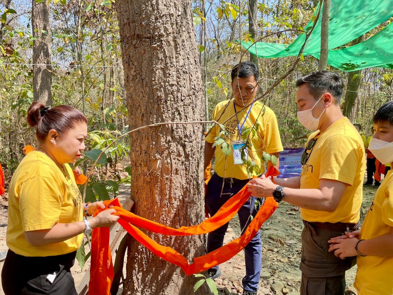 เพื่อเป็นการร่วมอนุรักษ์ผืนป่าและสิ่งแวดล้อม ผู้เข้าร่วมโครงการฯ ได้ร่วมกันทำกิจกรรมบวชป่าและกิจกรรมปลูกป่า ณ ป่าชุมชนบ้านสาแพะ เพื่อเป็นกุศโลบายห้ามไม่ให้คนมาตัดไม้ทำลายป่า และเพื่อคงความอุดมสมบูรณ์ของป่าธรรมชาติไว้ อีกทั้งยังช่วยให้แหล่งน้ำไม่เหือดแห้ง ฝนตกต้องตามฤดูกาล และที่สำคัญคือ เป็นการสร้างสำนึกให้แก่ชุมชนในการมีส่วนร่วมดูแลสภาพสิ่งแวดล้อม เพื่อรักษาพื้นที่ป่าที่เป็นต้นน้ำลำธารเอาไว้ และยังได้เรียนรู้แนวคิดเรื่องการบริหารจัดการทรัพยากรน้ำรูปแบบต่าง ๆ ตามแนวพระราชดำริในพื้นที่บ้านสาแพะใต้อีกด้วย เช่น “สระพวง” หนึ่งในตัวช่วยสำคัญสำหรับการบริหารจัดการน้ำบนพื้นที่สูง ที่ช่วยในเรื่องการกักเก็บน้ำไว้ใช้ในยามแห้งแล้ง โดยมีกระบวนการเริ่มจากการขุดสระแม่ หรือสระขนาดใหญ่บนพื้นที่สูงสำหรับกักเก็บน้ำ จากนั้นเชื่อมต่อการส่งน้ำลงมายังสระลูกสระหลานในพื้นที่ที่ต่ำกว่า เพื่อใช้สำหรับทำการเกษตร และ “ฝาย” ที่สร้างจากวัสดุที่หาง่ายในท้องถิ่น เช่น หิน กรวด ไม้ไผ่ ขวางกั้นลำธาร ช่วยชะลอการไหลของน้ำให้ช้าลง อีกทั้งยังช่วยเรื่องการฟื้นฟูป่า หยุดไฟป่า สร้างความสมดุลให้ระบบนิเวศ และเป็นแหล่งน้ำสำหรับการอุปโภค บริโภค รวมถึงการเกษตร ซึ่งถือเป็นวิธีที่ง่าย และเหมาะสม ในการดูแล และฟื้นฟูทรัพยากรธรรมชาติอีกด้วย