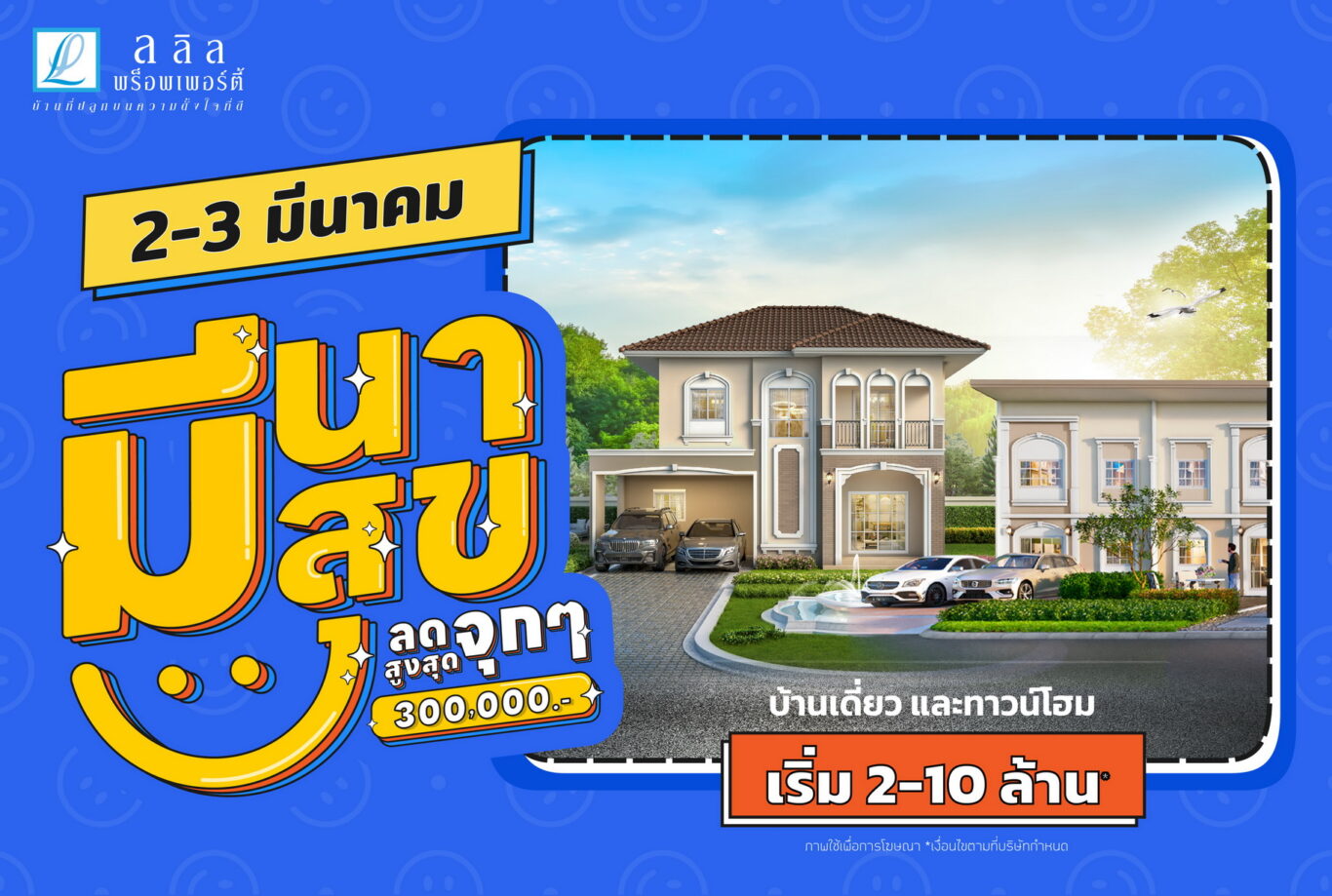 บริษัท ลลิล พร็อพเพอร์ตี้ จำกัด (มหาชน) หรือ (LALIN) ผู้พัฒนาโครงการอสังหาริมทรัพย์คุณภาพภายใต้คอนเซ็ปต์ ‘บ้านที่ปลูกบนความตั้งใจที่ดี’ มอบโปรฯพิเศษ‘มีนา มีสุข ลดจุกๆ สูงสุด 300,000 บาท” เปลี่ยนฝันคนอยากมีบ้านให้กลายเป็นจริง เต็มอิ่มกับความคุ้มค่าคุ้มราคาครบฟังก์ชันกันแบบจุใจ เมื่อซื้อบ้านเดี่ยว ทาวน์โฮม และบ้านแนวคิดใหม่ทำเลคุณภาพทุกระดับราคาตั้งแต่ 2-10 ล้านบาท ทั้งในกรุงเทพฯ ปริมณฑล และต่างจังหวัด จากแบรนด์ต่างๆ ในเครือของ ลลิล พร็อพเพอร์ตี้ ประกอบด้วย แลนซีโอ, ไลโอ, บ้านลลิล และลลิล กรีนวิลล์ ที่พัฒนาภายใต้แนวคิด Green Living Standard ออกแบบและคัดสรรวัสดุที่เป็นมิตรใส่ใจโลกและสิ่งแวดล้อม เพิ่มพื้นที่สีเขียวที่มีขนาดใหญ่ เพื่อสร้างสรรค์สังคมคุณภาพเพื่อการอยู่อาศัยอย่างยั่งยืน ครบครันด้วยสิ่งอำนวยความสะดวกที่ทันสมัย พร้อมระบบรักษาความปลอดภัยตลอด 24 ชั่วโมง โดดเด่นด้วยความเป็นบ้านแบบมัลติฟังก์ชันที่สามารถใช้ประโยชน์ได้คุ้มค่าในทุกมุมของบ้าน เพื่อให้สมาชิกทุกคนในครอบครัวได้อยู่อาศัยในพื้นที่ที่ตอบโจทย์ไลฟ์สไตล์แห่งความสุขได้อย่างแท้จริง