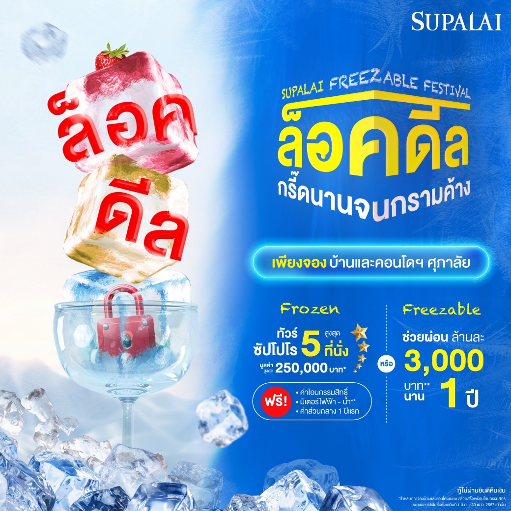 ศุภาลัยไม่รอช้าเอาใจคนอยากมีบ้าน ยกขบวนพาเหรดโครงการคุณภาพ ทั้งบ้านและคอนโดมิเนียมพร้อมอยู่ของบริษัทฯ ทั่วประเทศ จัดดีลแน่นๆ แบบหนาวแน่ๆ กับโปรฯ ที่คุ้มจนกรามค้าง “SUPALAI FREEZABLE FESTIVAL” ล็อคดีลกรี๊ดนานจนกรามค้างกับข้อเสนอสุดพิเศษให้คุณเลือกได้ตามใจ Choice A – Frozen ทัวร์ซัปโปโร สูงสุด 5 ที่นั่ง มูลค่าสูงสุด 250,000 บาท* พร้อมฟรี! ค่าโอนกรรมสิทธิ์ มิเตอร์ไฟฟ้า – น้ำ ค่าส่วนกลาง 1 ปีแรก Choice B – Freezable ศุภาลัยช่วยผ่อนล้านละ 3,000 บาท* นาน 1 ปี (เงื่อนไขเป็นไปตามที่บริษัทฯ กำหนด) ยังไม่หมด…กรี๊ดกันรัวๆ หากลูกค้ากู้ไม่ผ่านยินดีคืนเงิน เตรียมช้อปสนุกกับส่วนลดสนั่น “SUPALAI FREEZABLE FESTIVAL” ได้ตั้งแต่วันที่ 1 มี.ค. – 30 เม.ย. 67 เท่านั้น