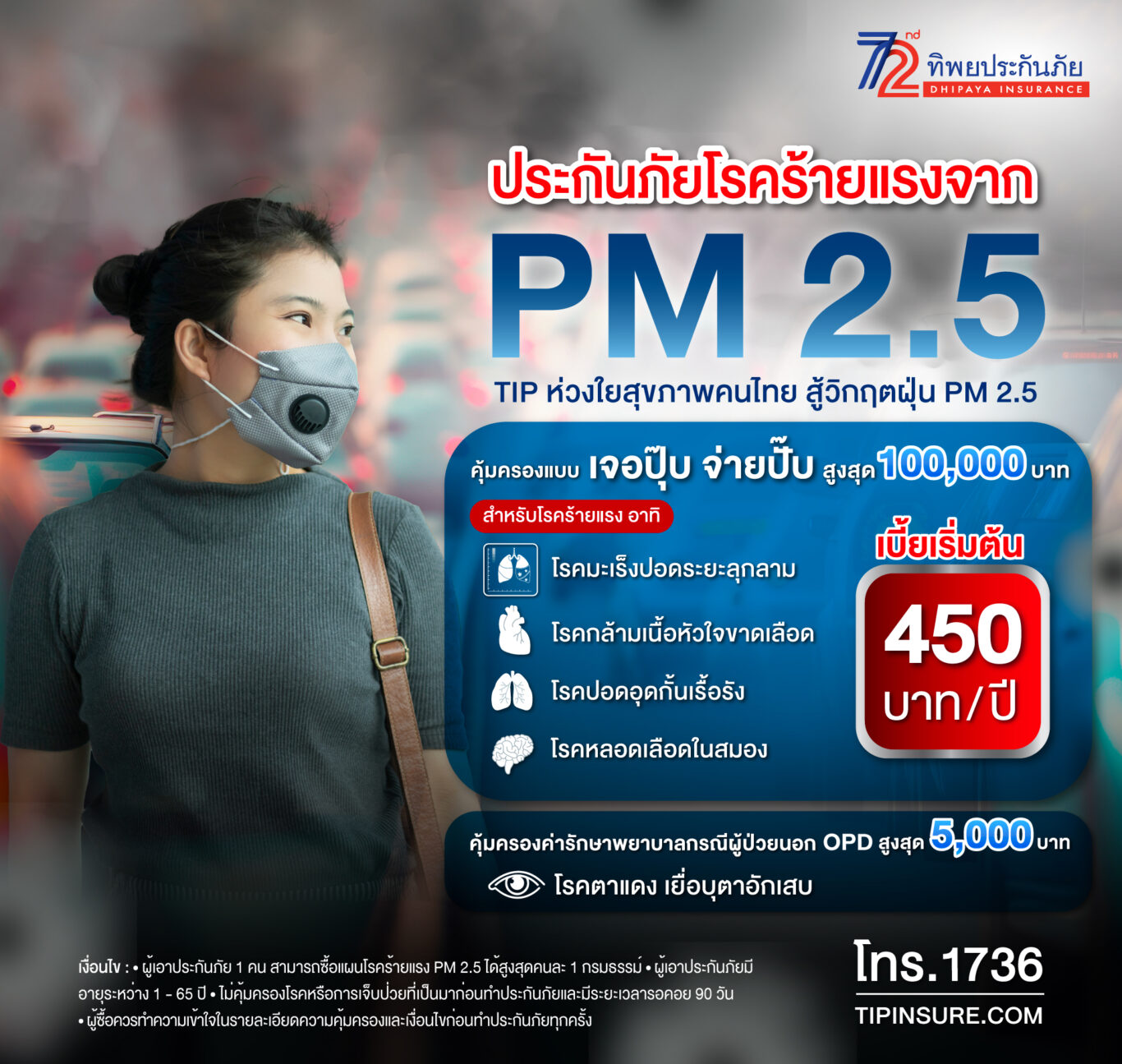 นางสาวณฐินี ธนะรัชต์ ผู้ช่วยกรรมการผู้จัดการใหญ่ หน่วยธุรกิจประกันภัยสุขภาพฯ บริษัท ทิพยประกันภัย จำกัด (มหาชน) เผยว่า “ปัญหามลพิษทางอากาศโดยเฉพาะฝุ่นละออง PM 2.5 เป็นปัญหาวิกฤติที่ส่งผลกระทบสะสมต่อสุขภาพของประชาชนมายาวนานต่อเนื่อง กรมธรรม์ประกันภัยโรคร้ายแรงจาก PM 2.5 มุ่งเน้นให้ความคุ้มครองแก่ประชาชนจากโรคร้ายแรงที่อาจเกิดขึ้นจากฝุ่น PM 2.5 ด้วยเบี้ยประกันภัยเริ่มต้นเพียง 450 บาทต่อปี ให้ความคุ้มครองสูงสุดถึง 100,000 บาท รับประกันภัยตั้งแต่อายุ 1 – 65 ปี คุ้มครองโรคร้ายแรงจาก PM 2.5 เช่น โรคหลอดเลือดสมองแตกหรืออุดตัน โรคมะเร็งปอดระยะลุกลาม โรคหลอดลมปอดอุดกั้นเรื้อรังขั้นรุนแรง / โรคปอดระยะสุดท้าย และโรคกล้ามเนื้อหัวใจตายเฉียบพลันจากการขาดเลือด คุ้มครองค่ารักษาพยาบาลแบบผู้ป่วยนอก ในกรณีที่เจ็บป่วยด้วยโรคตาแดง เยื่อบุตาอักเสบ ซึ่งเราหวังว่ากรมธรรม์ประกันภัยนี้จะเป็นทางเลือก ให้กับประชาชนในการรับมือกับภัยเงียบจากฝุ่น PM 2.5