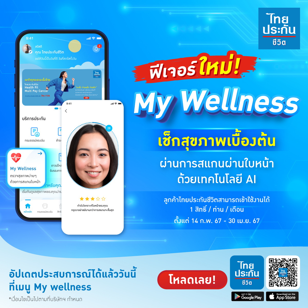 และเพื่อเติมเต็มการใช้ชีวิตอย่างครบรอบด้านให้กับลูกค้า บริษัทฯ จึงได้พัฒนาแอปพลิเคชัน ไทยประกันชีวิต ให้เป็นแอปพลิเคชันที่ส่งมอบคุณค่าและประสบการณ์ที่ดีให้กับลูกค้า ด้วยการพัฒนาฟีเจอร์ใหม่ My Wellness Vital Scan บริการเช็กสุขภาพเบื้องต้นผ่านการสแกนใบหน้าด้วยเทคโนโลยี AI สำหรับลูกค้าที่มีอายุตั้งแต่ 13 ปีขึ้นไป โดยตรวจเช็กค่าสุขภาพ 9 ด้าน ได้แก่ คะแนนรวมด้านสุขภาพ, อัตราการเต้นของหัวใจ, ความดันโลหิต, อัตราการหายใจ, ดัชนีมวลกาย (BMI), อัตราส่วนรอบเอวต่อส่วนสูง, ดัชนีรูปร่าง, ระดับความเครียด และอายุผิวหน้า โดยลูกค้าสามารถใช้บริการ 1 ครั้ง/คน/เดือน ได้จนถึง 30 เมษายน 2567 และตั้งแต่เดือนพฤษภาคม 2567 เป็นต้นไป จะสามารถใช้สิทธิ์ได้ตามระดับสมาชิกไทยประกันชีวิต Privilege คือ ไทยประกันชีวิต Infinite จะได้รับสิทธิ์ 2 ครั้ง/คน/เดือน สำหรับไทยประกันชีวิต Ultimate, ไทยประกันชีวิต Primeและผู้เข้าใช้งานแอปพลิเคชันที่ไม่ได้เป็นสมาชิกไทยประกันชีวิต Privilege จะได้รับสิทธิ์ 1 ครั้ง/คน/เดือน