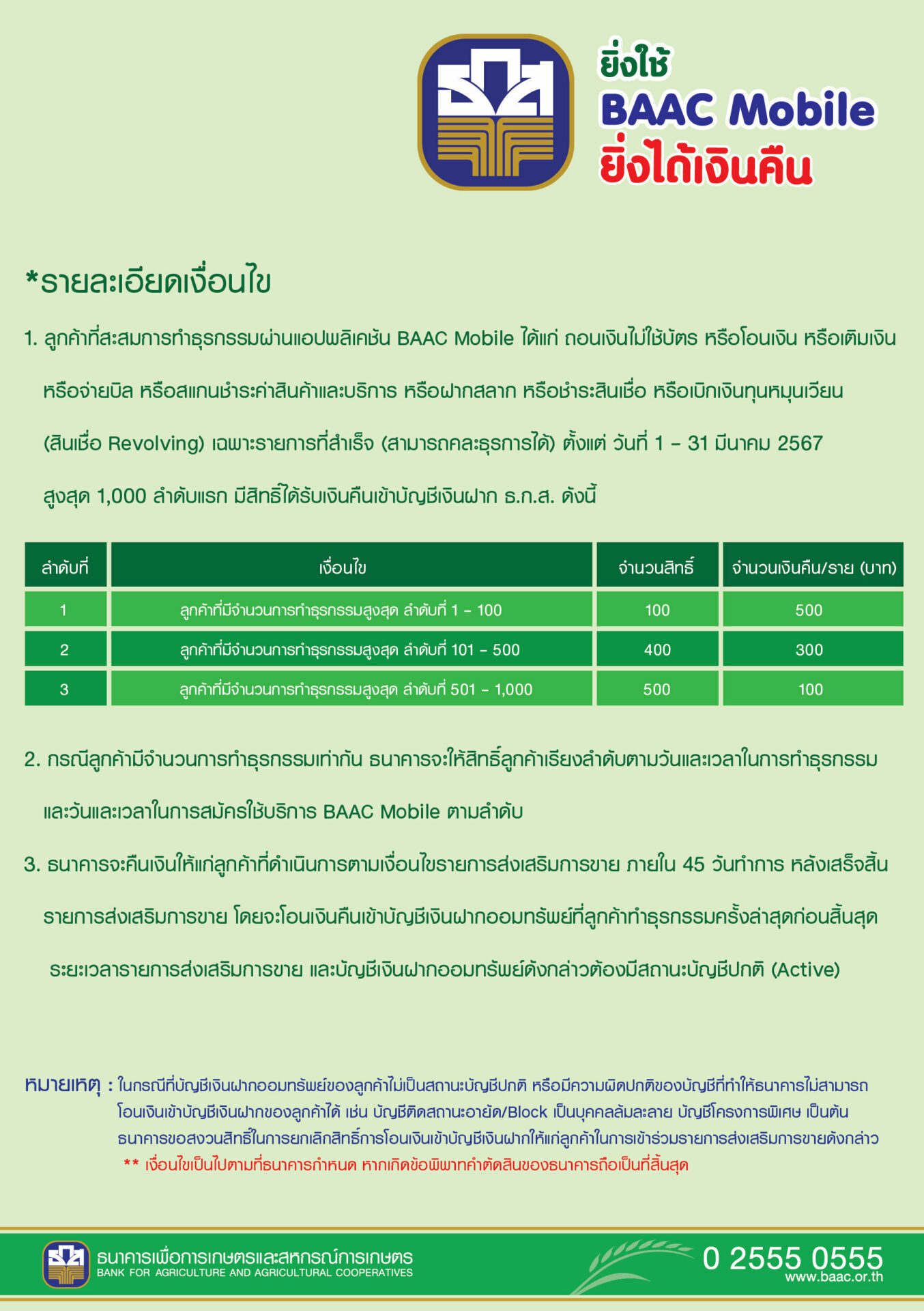 ธนาคารเพื่อการเกษตรและสหกรณ์การเกษตร (ธ.ก.ส.) จัดแคมเปญ “ยิ่งใช้ BAAC Mobile ยิ่งได้เงินคืน” เพียงทำธุรกรรมผ่านแอปพลิเคชัน BAAC Mobile สะสมรายการสูงสุดเป็น 1,000 ลำดับแรก ทั้งการถอนเงินโดยไม่ใช้บัตร การโอนเงิน การเติมเงิน การจ่ายบิล การชำระสินเชื่อ การสแกนชำระสินค้าและบริการ รวมไปถึงการฝากสลาก รับเงินคืนสูงสุด 500 บาท โดยผู้ที่มีปริมาณการทำธุรกรรมสูงสุด ลำดับที่ 1 – 100 จะได้รับเงินคืน 500 บาท/ราย ลำดับที่ 101 – 500 จะได้รับเงินคืน 300 บาท/ราย และลำดับที่ 501 – 1,000 จะได้รับเงินคืน 100 บาท/ราย ยิ่งทำธุรกรรม ยิ่งมีสิทธิ์รับเงินคืน เริ่มแล้วตั้งแต่วันที่ 1 – 31 มีนาคม 2567