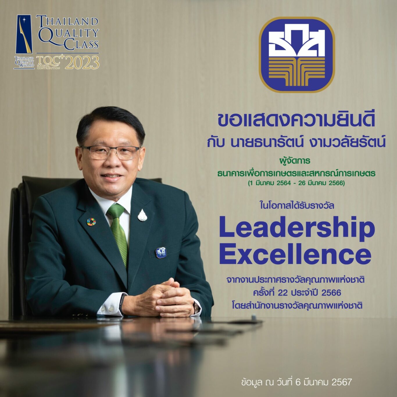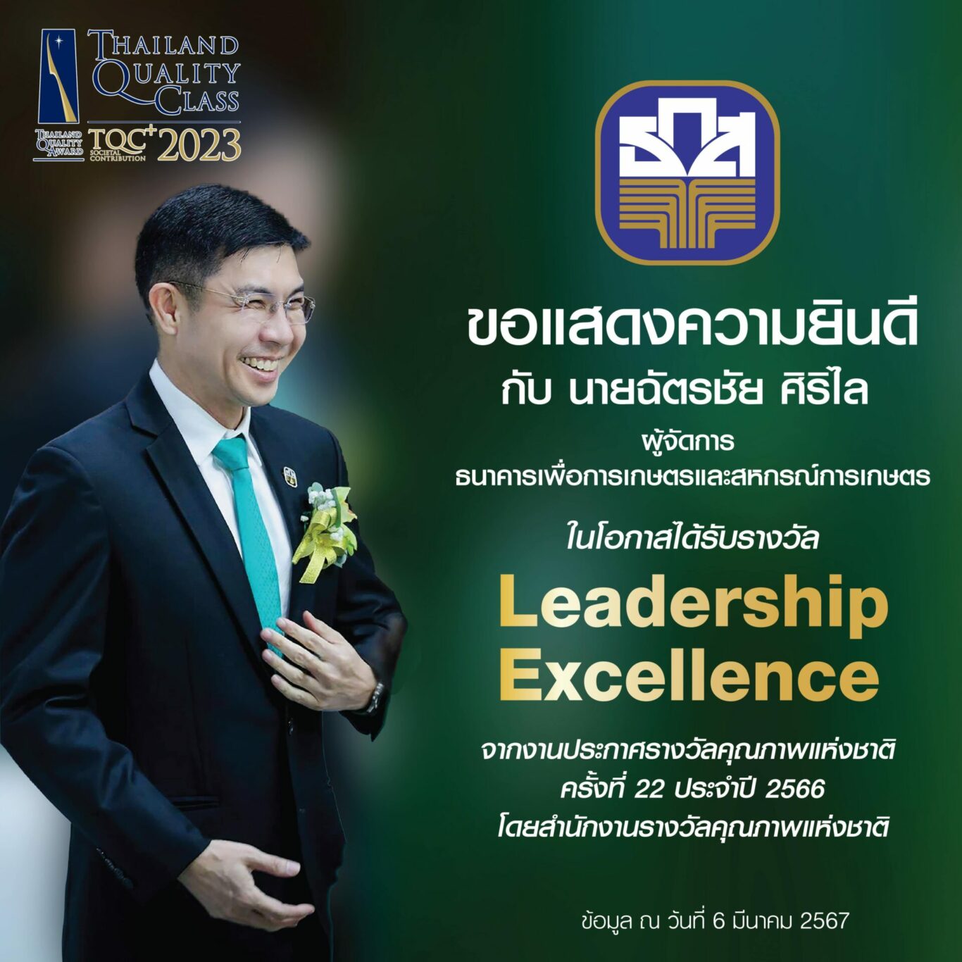 นายฉัตรชัย ศิริไล ผู้จัดการ ธ.ก.ส. และ นายธนารัตน์ งามวลัยรัตน์ อดีตผู้จัดการ ธ.ก.ส. ยังได้รับรางวัล Leadership ExcellenceAward ซึ่งเป็นผู้นำสูงสุดขององค์กรที่มีส่วนร่วมในการขับเคลื่อนและผลักดันการนำเกณฑ์รางวัลคุณภาพแห่งชาติไปปรับใช้ในการดำเนินงาน โดยมีคณะผู้บริหาร ธ.ก.ส. เข้าร่วมงาน เมื่อวันที่ 6 มีนาคม 2567 ณ หอประชุมใหญ่ ศูนย์วัฒนธรรมแห่งประเทศไทย กรุงเทพฯ