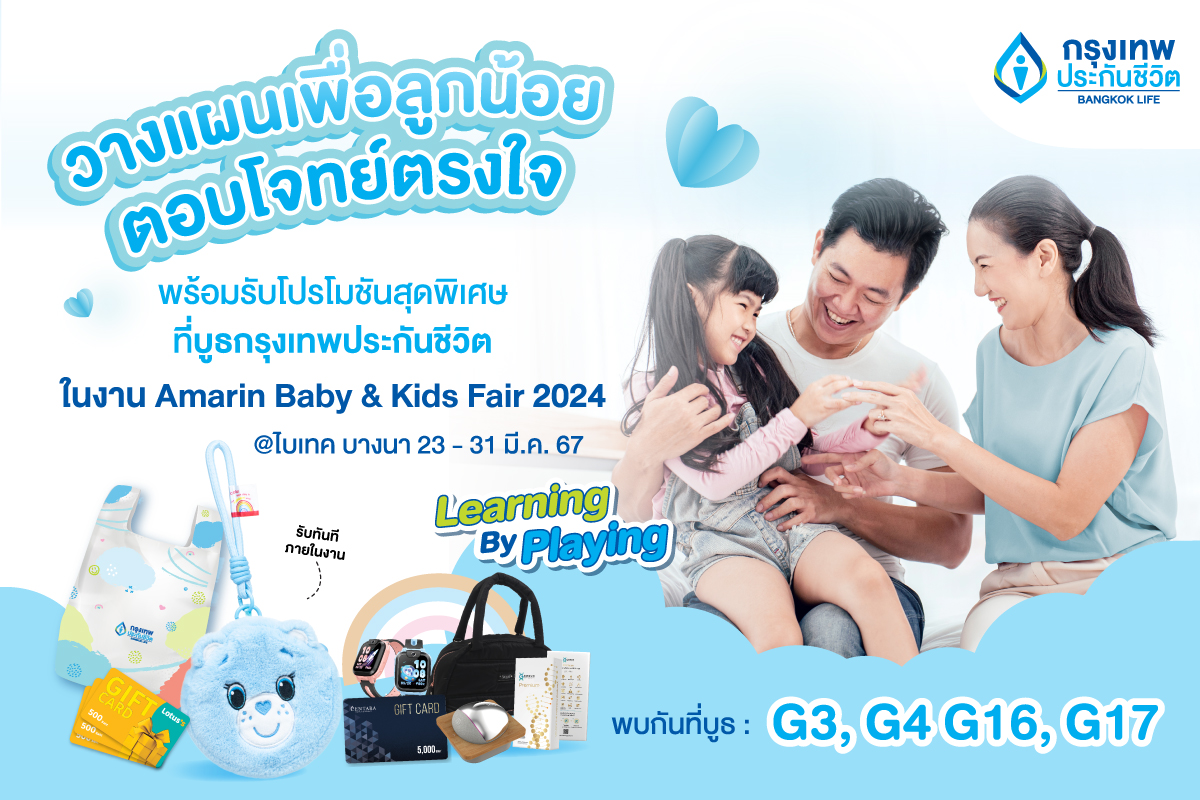 กรุงเทพประกันชีวิต ร่วมออกบูธงาน Amarin Baby & Kids Fair ครั้งที่ 27 ด้วยแนวคิด “Learning By Playing” มุ่งเน้นการเสริมสร้างพัฒนาการเรียนรู้ของลูกน้อยด้วยแผนความคุ้มครองที่คัดสรรมาด้วยความใส่ใจ ตอบโจทย์ความต้องการทุกครอบครัว ในการวางแผนเตรียมพร้อมด้านสุขภาพ ค่ารักษาพยาบาล และเตรียมเงินออมเพื่อเป็นทุนการศึกษาให้ลูกรัก พร้อมส่งมอบความใส่ใจด้วยกิจกรรมเสริมสร้างพัฒนาการลูกน้อย และให้คำปรึกษาวางแผนการเงินกับคุณพ่อคุณแม่ตามเป้าหมายที่ต้องการ