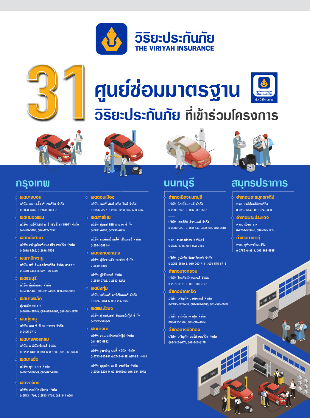 สำหรับศูนย์ซ่อมมาตรฐานวิริยะประกันภัยที่เข้าร่วมโครงการให้บริการตรวจรถฟรี จำนวน 31 แห่ง ได้แก่  1) บริษัท เฮงบอดี้คาร์ เซอร์วิส จำกัด 2) บริษัท วงษ์ศิริเลิศ คาร์ เซอร์วิส (1997) จำกัด 3) บริษัท เจริญภัภัณฑ์ยนตรกิจ เซอร์วิส จำกัด 4) บริษัท นที อินเตอร์เซอร์วิส จำกัด สาขา 1 5) บริษัท อู่แม่กลอง จำกัด 6) อู่ร่วมมิตรการาจ 7) บริษัท เอส ซี ซี 65 การาจ จำกัด 8) บริษัท อ.พิพัฒน์ยนต์ จำกัด 9) บริษัท คุงการาจ จำกัด 10) บริษัท เซอร์กิตบริการ จำกัด 11) บริษัท เพอร์เฟคท์ สปีด ไลน์ จำกัด 12) บริษัท อู่บอส 888 การาจ จำกัด 13) บริษัท ธนพัฒน์ ออโต้ เซ็นเตอร์ จำกัด 14) บริษัท อู่กังวานชัยการช่าง จำกัด 15) บริษัท อู่วิชัยยนต์ จำกัด 16) บริษัท เทวินทร์ คาร์เซ็นเตอร์ จำกัด 17) บริษัท อู่ เอส.เอส. อินเตอร์กรุ๊ป จำกัด 18) บริษัท เจ.เอส.อินเตอร์ กรุ๊ป จำกัด 19) บริษัท รุ่งเจริญ บอดี้ คลีนิก จำกัด 20) บริษัท สุขุมวิท เอ.ที. เซอร์วิส จำกัด 21) บริษัท นิวเพื่อนยนต์ จำกัด 22) บริษัท เซอร์กิต ติวานนท์ จำกัด 23) หจก. งามวงศ์วาน คาร์แคร์ 24) บริษัท อู่นำชัย รัตนาธิเบศร์ จำกัด 25) บริษัท ไทยรัตน์ยานยนต์ จำกัด 26) บริษัท เจริญกิจ ราชพฤกษ์ จำกัด 27) บริษัท อู่นำชัย เตาปูน จำกัด 28) บริษัท เจริญกิจ ออโต้ เซอร์วิส จำกัด 29) หจก. เจดีย์ออโต้เซอร์วิส 30) หจก. เป้งการาจ 31) หจก. สุทินคาร์เซอร์วิส