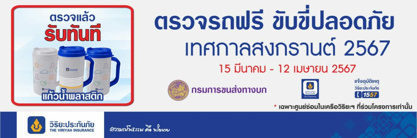 บริษัท วิริยะประกันภัย จำกัด (มหาชน) ร่วมกับ กรมการขนส่งทางบก จัดกิจกรรม “ตรวจรถฟรี ขับขี่ปลอดภัย” เพื่อรณรงค์ด้านความปลอดภัยทางถนนและอำนวยความสะดวกให้แก่ประชาชนที่เดินทางไกลช่วงเทศกาลสงกรานต์ 2567 ซึ่งบริษัทฯ มุ่งส่งเสริมการป้องกันและลดอุบัติเหตุบนท้องถนน ด้วยการสร้างความตระหนักรู้ให้กับผู้ใช้รถใช้ถนนเล็งเห็นความสำคัญของการตรวจเช็คความพร้อมของสภาพรถยนต์ก่อนออกเดินทางทุกครั้ง โดยให้บริการตรวจสภาพรถยนต์เบื้องต้นฟรี 20 รายการ ภายหลังตรวจรถยนต์เสร็จตอบแบบสอบถามผ่าน QR CODE รับทันทีแก้วน้ำพลาสติกเป็นของที่ระลึก (ของมีจำนวนจำกัด) ณ ศูนย์ซ่อมมาตรฐานวิริยะประกันภัย ในพื้นที่กรุงเทพฯ และปริมณฑล จำนวน 31 แห่ง สามารถเข้ารับบริการได้ตั้งแต่วันนี้ – 12 เมษายน 2567